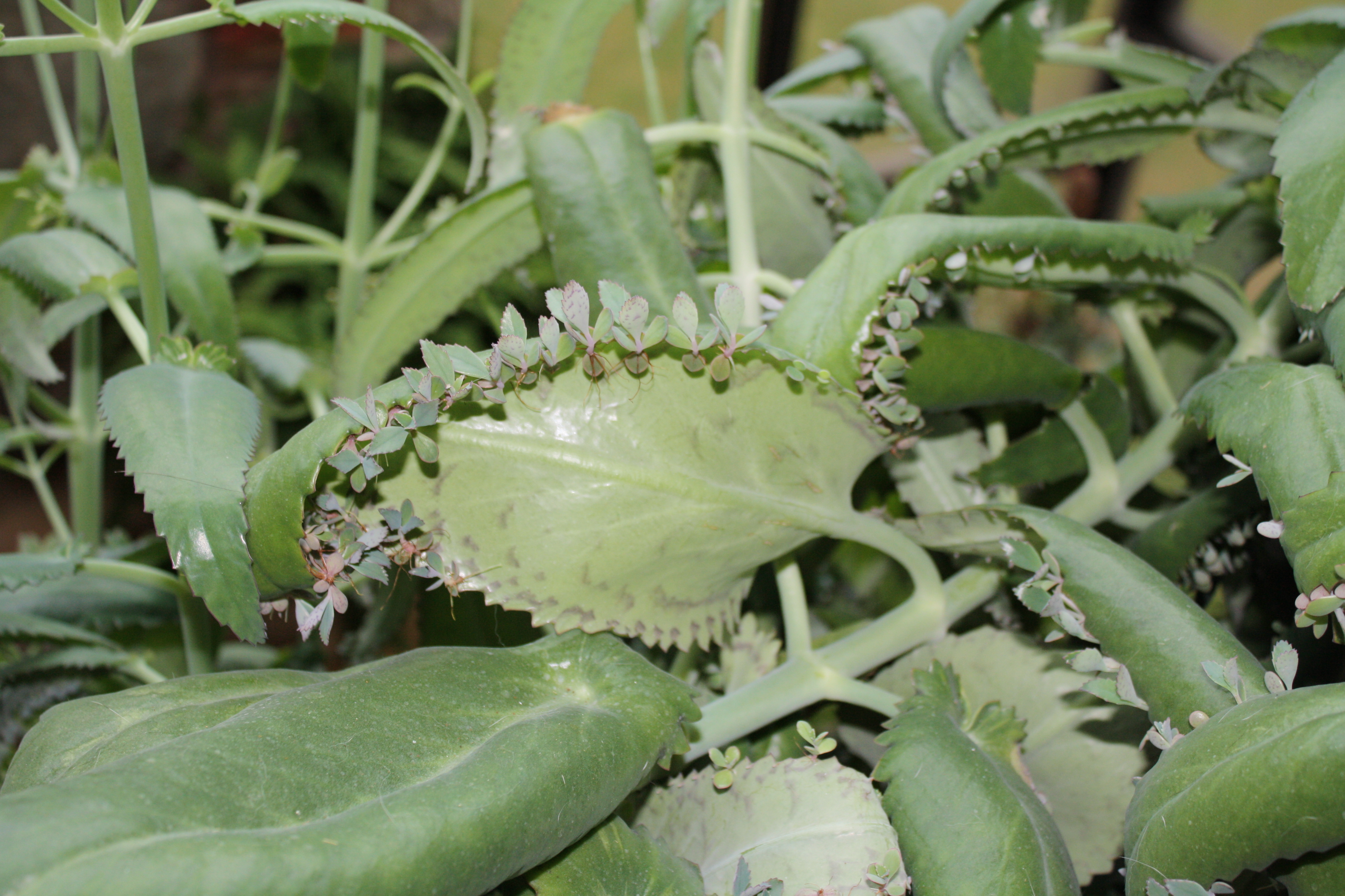 Morfoloģija. Mūžzaļš, daudzgadīgs, stāvs, spēcīgs, nezarots, samērā ātraudzīgs sukulents ar simetriski izkārtotām lapām. Telpās izaug līdz 100 cm augsts. Apakšējā stumbra daļa pārkoksnējas, kaila. Lapas garenas, brūngani plankumainas, sulīgas, gar robotajām malām bagātīgi attīstās vairvasas. Dzinuma galotnē gara, zarota ziedkopa ar brūngani violetiem, nokareniem, zvanveida ziediem. Zied ziemā, pavasarī.