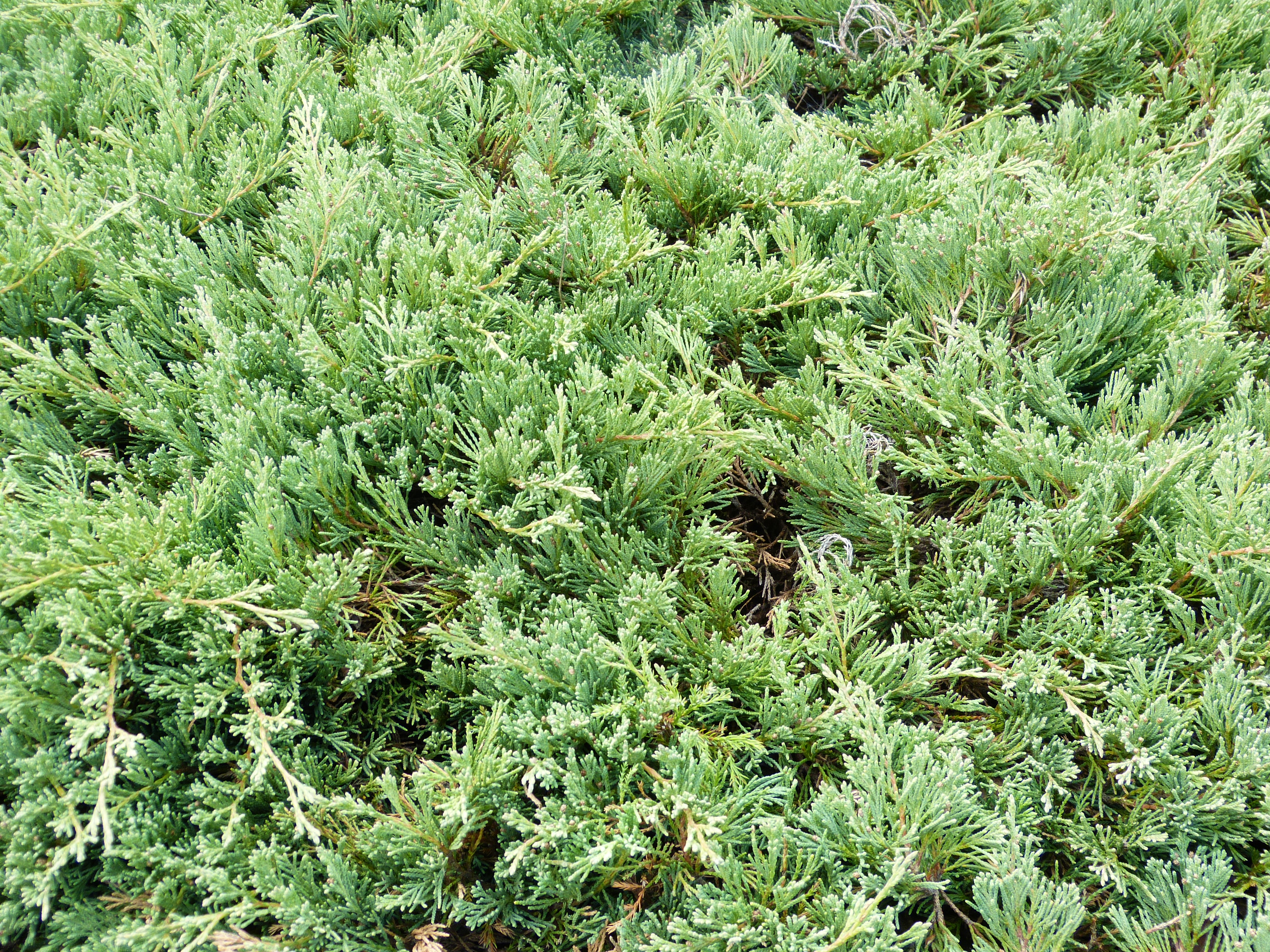 Morfoloģija. Klājenisks krūms ar spilvenveida, lielākā vecumā - šķīvjveida vainagu, augstums 0.3-0.5 m, platums līdz 1.5 m. Zari aug radiāli no stumbra uz visām pusēm, dzinumu gali aug slīpi augšup. Miza pelēkbrūna. Skujas gan adatveida, gan zvīņveida, sīkas, koši zaļas, rudenī krāsojas skaistā purpurbrūnā tonī. Čiekurogas lodveida, mazas, gaiši zilas ar pelēku apsarmi, veidojas reti.