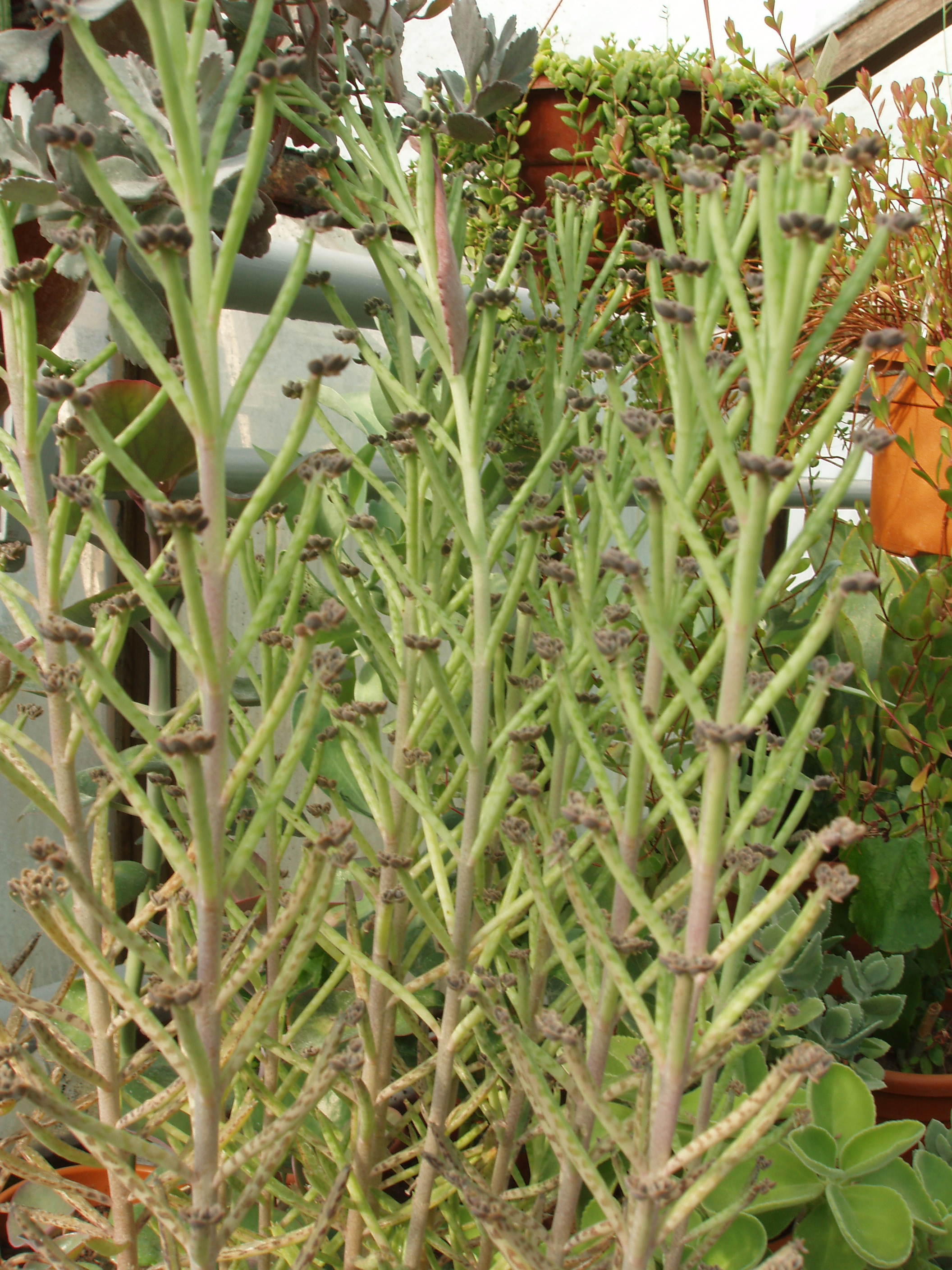 Morfoloģija. Mūžzaļš, daudzgadīgs, stāvs, spēcīgs, nezarots, ātraudzīgs sukulents ar simetriski izkārtotām lapām. Telpās izaug līdz 50-60 cm augsts. Apakšējā stumbra daļa pārkoksnējas, kaila. Lapas garas, apaļas trubveida, pelēkzaļas ar brūniem plankumiem, sulīgas, vairvasas veidojas lapu galos. Dzinuma galotnē gara, zarota ziedkopa ar sārtiem brūngani violetiem, nokareniem, zvanveida ziediem. Zied ziemā, pavasarī.