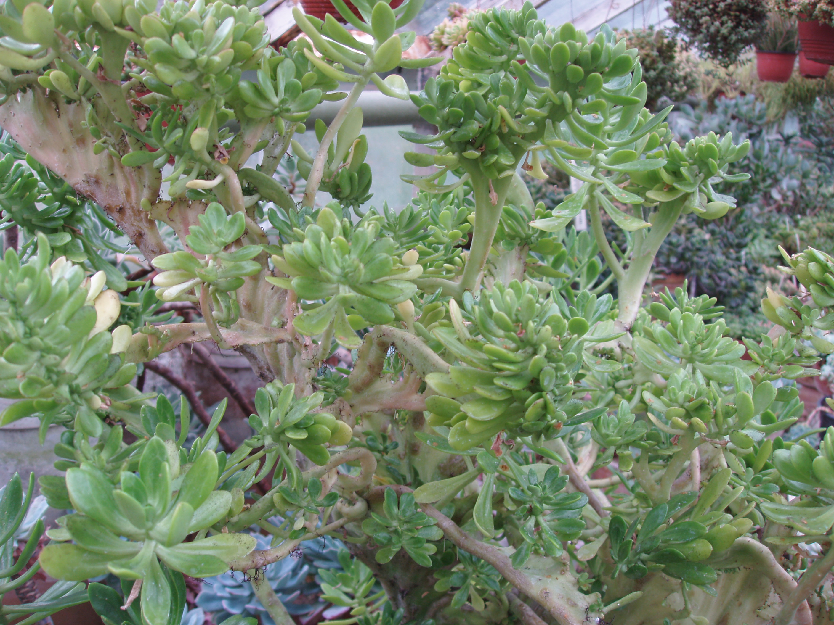 Morfoloģija. Mūžzaļš, daudzgadīgs, stāvs, stingru dzinumu, ātraudzīgs sukulents ar simetriski izkārtotām palielām lapām. Telpās izaug 40-60 cm augsts. Apakšējā stumbra daļa pārkoksnējas. Stumbrs resns, ciets, kristāta formas. Lapas spīdīgas, zaļgandzeltenas, garenas, ar apaļu galu, gludām malām.