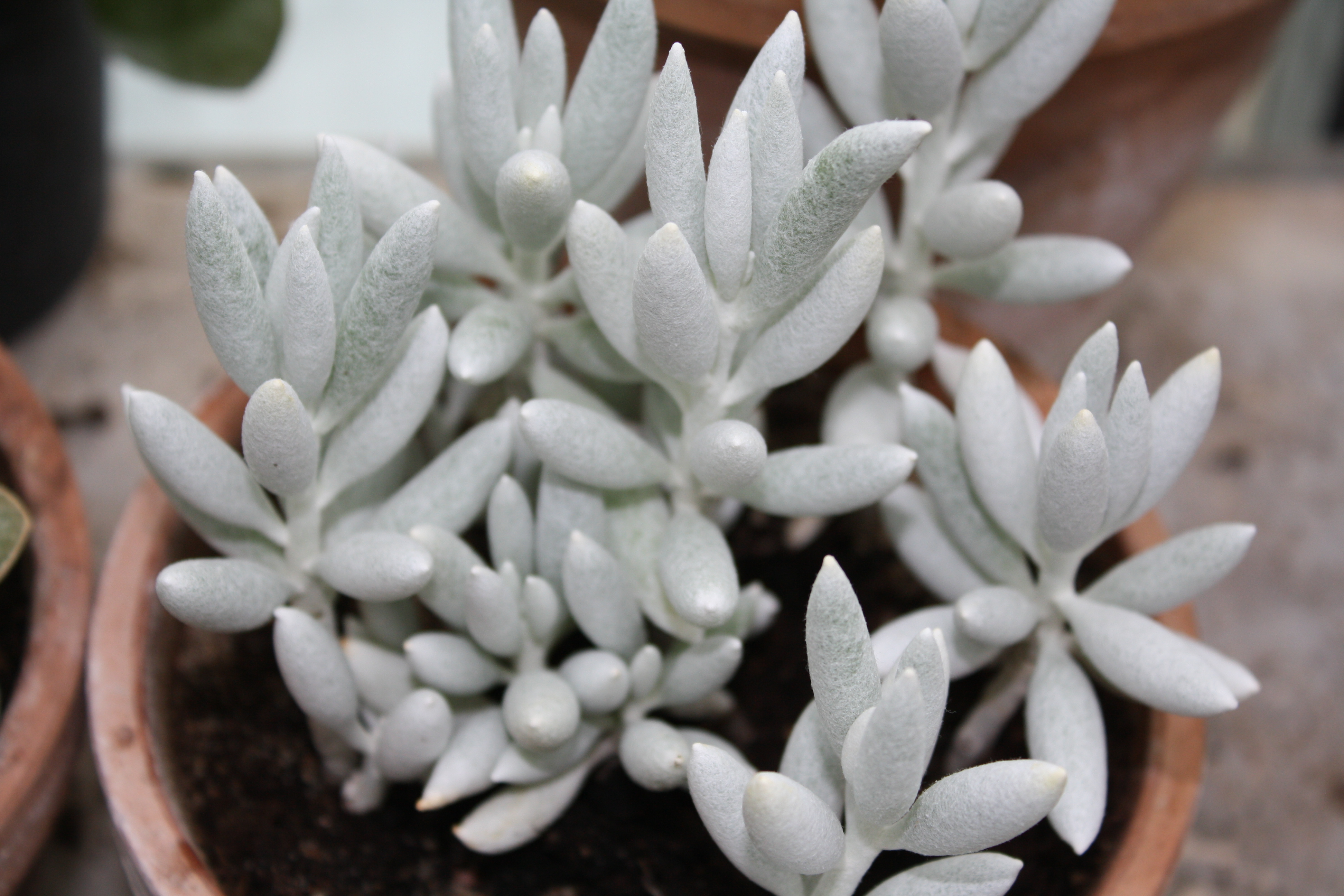 Morfoloģija. Mūžzaļš, daudzgadīgs lapu sukulents ar 3-5 cm garām, sfēriski apaļām, garenām, koši baltu, pūkainu, sīku matiņu apsarmi klātam lapām. Daudzzarainais krūms izaug 20-30 cm augsts. Sakņu sistēma spēcīga un plaša. Ziedi necili. Zied pavasarī.