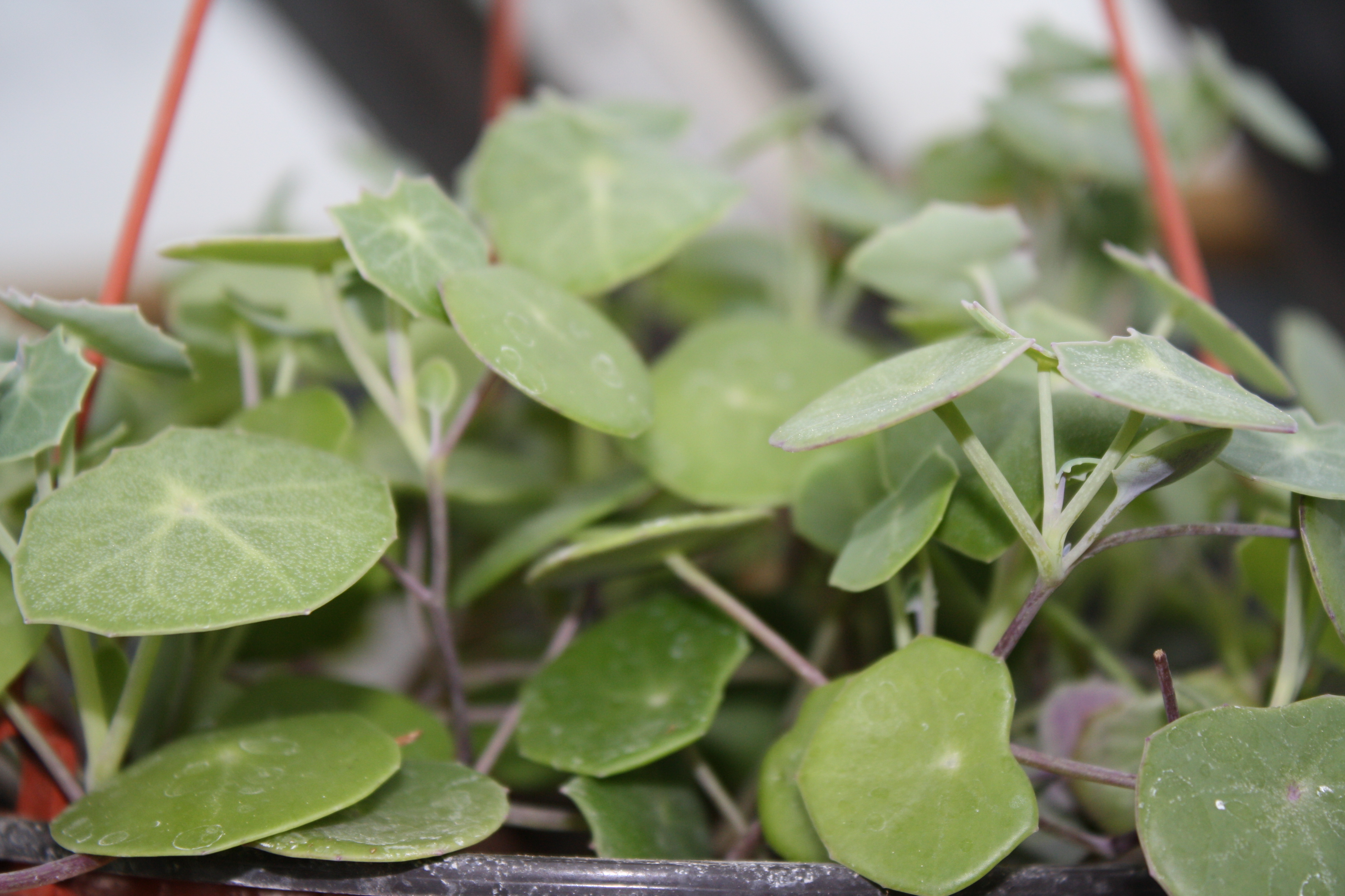 Morfoloģija. Mūžzaļš, daudzgadīgs lapu sukulents ar apaļām, sulīgām, zilganzaļā, nelielām lapām, kurās krasi iezīmētas dzīslas. Lapas uz gariem kātiem, piestiprinātas pie resniem, vijīgiem, nokareniem stumbriem. Dzinumi izaug 1-1,5 metrus gari. Sakņu sistēma spēcīga un plaša. Ziedi attīstās reti.