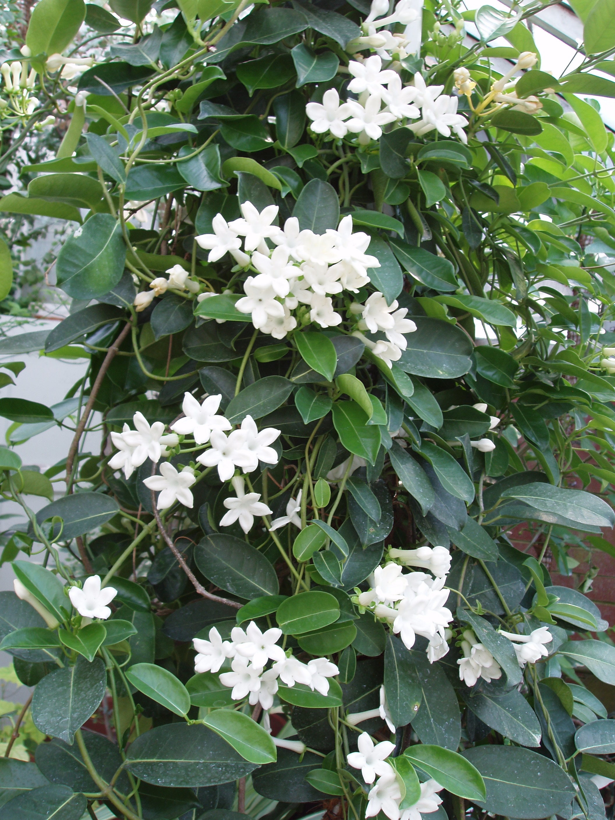 Morfoloģija. Mūžzaļš, daudzgadīgs lakstaugs – vīteņaugs un kāpelētājaugs ar 3-4 metrus gariem stumbriem, kurus biezi klāj tumši zaļas, spīdīgas, vaskainas, gareni ovālas lapas un īsiem kātiem. Bagātīga, bet neliela bārkšsakne. Sniegbaltie, vaska apsarmi klātie, spēcīgi smaržojošie ziedi salikti pagarā ķekarā. Ziedi attīstās uz jaunajiem dzinumiem, daudzgadīgajos, pārkoksnētos dzinumos ziedi neveidojas. Zied no jūnija līdz septembrim.