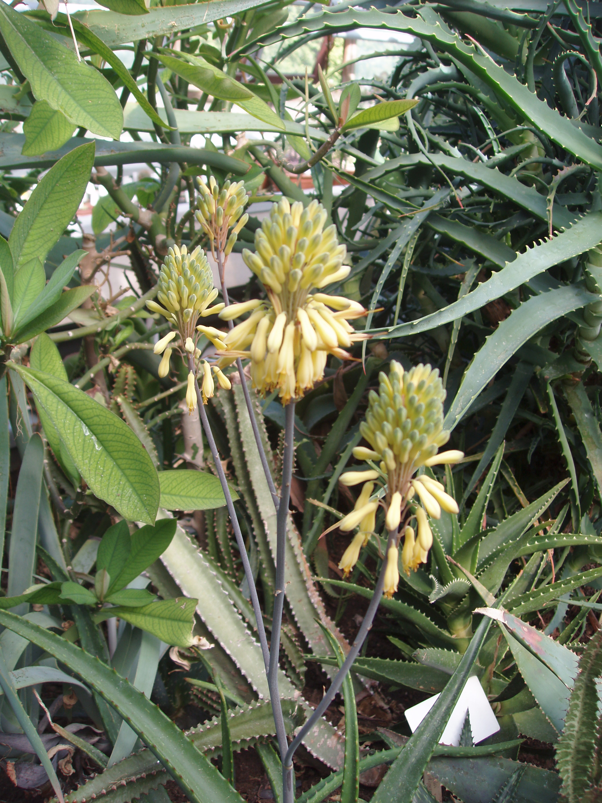Morfoloģija. Mūžzaļš, daudzgadīgs lapu sukulents, kas telpās neizaug garāks par 1 metru. Daudzie dzinumi veido krūmu. Spēcīga sakne. Stumbrs resns, ciets, noturīgs un spēcīgs. Lapas tumši zaļas, biezas, spīdīgas, sulīgas, līdz 40 cm garas un ap 9 cm platas pie pamatnes, gludas vai viegli viļņainas. Jaunās lapas nedaudz sārti iekrāsotas. Lapu malās dzeloņi 8-9 mm attālumā viens no otra. Zieds attīstās galotnes sānos, aptuveni 40-50 cm augsts. Ziedi 4 cm gari, oranžšarlaksarkani, saliktā vārpā. Zied vasarā. Nogatavojas sēklas.