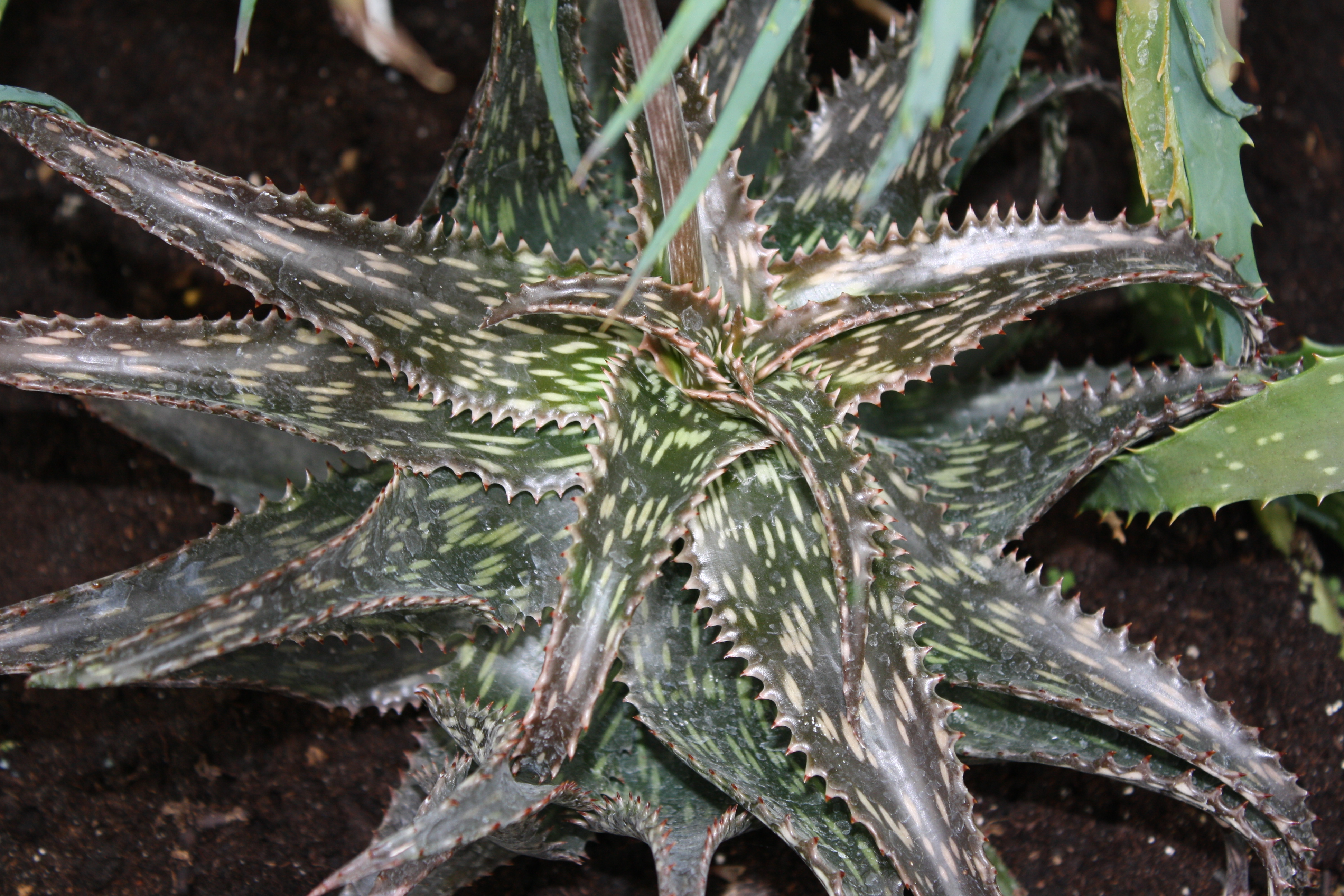 Morfoloģija. Mūžzaļš, daudzgadīgs lapu sukulents, kas telpās neizaug garāks par 20 cm. Daudzie dzinumi veido kuplu krūmu, no daudziem dzinumiem, diametrā ap 50 cm. Spēcīga sakne. Lapas tumši zaļas, biezas, spīdīgas, sulīgas, līdz 12 cm garas un ap 2-3 cm platas pie pamatnes, gludas, ar gaišzaļām, pārtrauktā, īsām šķērssvītrām un izplūdušiem plankumiem. Lapu malās īsi, sarkanbrūni dzeloņi 2 mm gari. Zieds attīstās galotnes sānos, aptuveni 30-40 cm augsts. Ziedi gaiši rozā, saliktā vārpā. Zied vasarā. Nogatavojas sēklas.