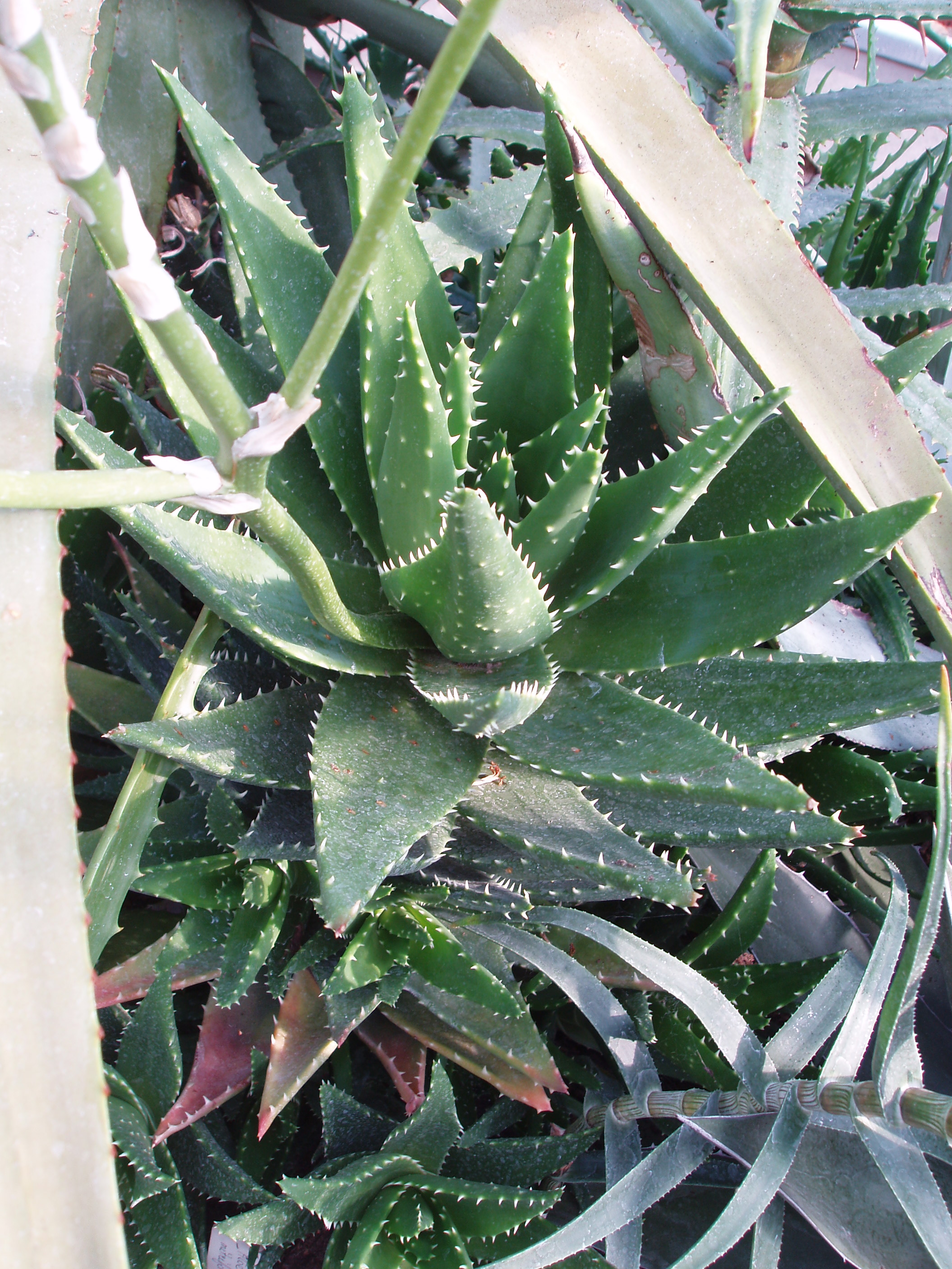 Morfoloģija. Mūžzaļš, daudzgadīgs lapu sukulents, kas telpās neizaug garāks par 60-80 cm. Atsevišķam augam var veidoties 4-6 cm diametra resns stumbrs. Daudzie dzinumi veido kuplu krūmu. Spēcīga sakne. Lapas tumši zaļas, biezas, spīdīgas, sulīgas, līdz 20 cm garas, pie pamatnes platas ar ieliektām malām. Lapu malās īsi, bālzaļi dzeloņi, kuri mēdz būt arī lapu apakšpusē. Lapu gali saulē krāsojas sarkanbrūni. Zieds attīstās galotnes sānos, aptuveni 40 -50 cm augsts. Ziedi šarlaksarkani, saliktā vārpā. Zied vasarā. Nogatavojas sēklas.