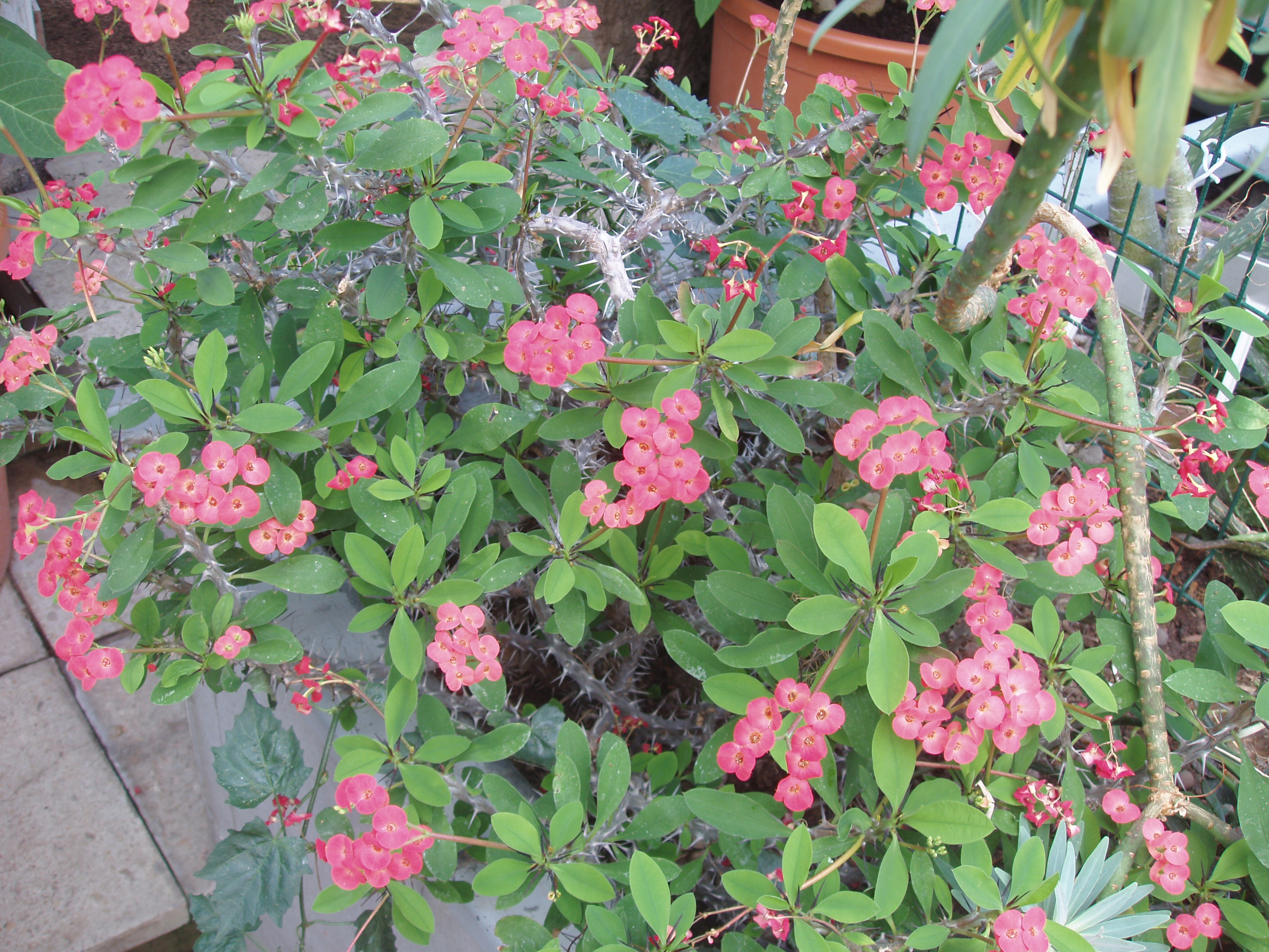 Morfoloģija. Mūžzaļš, daudzgadīgs, biezi zarots, līdz 1 metram augsts krūms – sukulents, kura pelēkzaļos, cietos, stingros stumbrus un zarus klāj ērkšķi. Lapas gaiši zaļas, otrādi olveida. Spēcīga bārkšsakne. Zied no pavasara līdz rudenim ar sīkiem, neuzkrītošiem ziediem, kuriem apkārt 2 spilgti sarkanas braktejas (augšlapas). Ziemas mēnešos, kad pietrūkst gaismas, augs var nomest lapas.