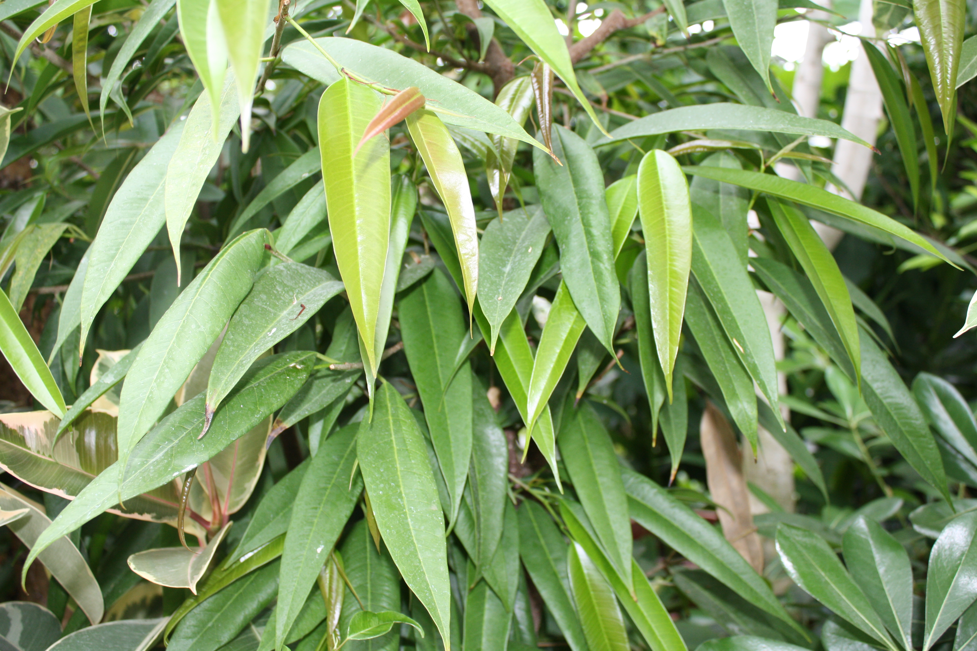 Morfoloģija. Mūžzaļš, daudzgadīgs koks, kurš telpās izaug 2-3 metru augstumā, bagātīgi zarots un lapots ar tumši zaļām 12-20 cm garām, spīdīgām, ādainām, ar izteiktu vidusdzīslu, smailu galu lapām. Lapas viegli nokarenas. Spēcīga bārkšsakne. Zied pavasarī, vasarā. Gaiši zaļi, zirņveida augļi.