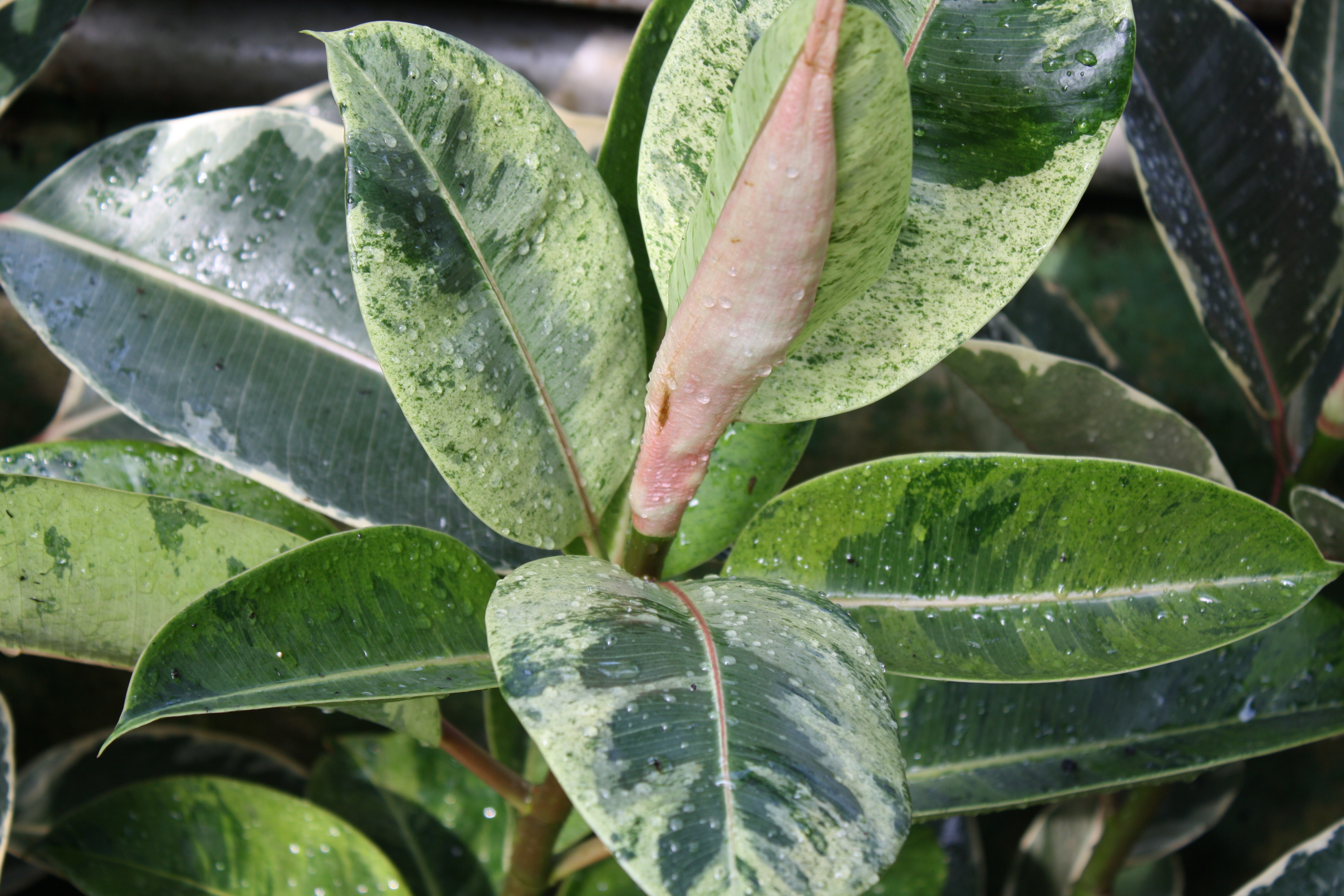 Morfoloģija. Mūžzaļš, daudzgadīgs, mazzarains krūms, kurš telpās izaug 2 metru augstumā un tikpat platumā. Lapas 20-25 cm garas un 10-15 cm platas, spīdīgas, ādainas, biezas, cietas, gaišzaļas ar dzelteniem neregulāriem plankumiem. Telpās nezied. Spēcīga bārkšsakne.