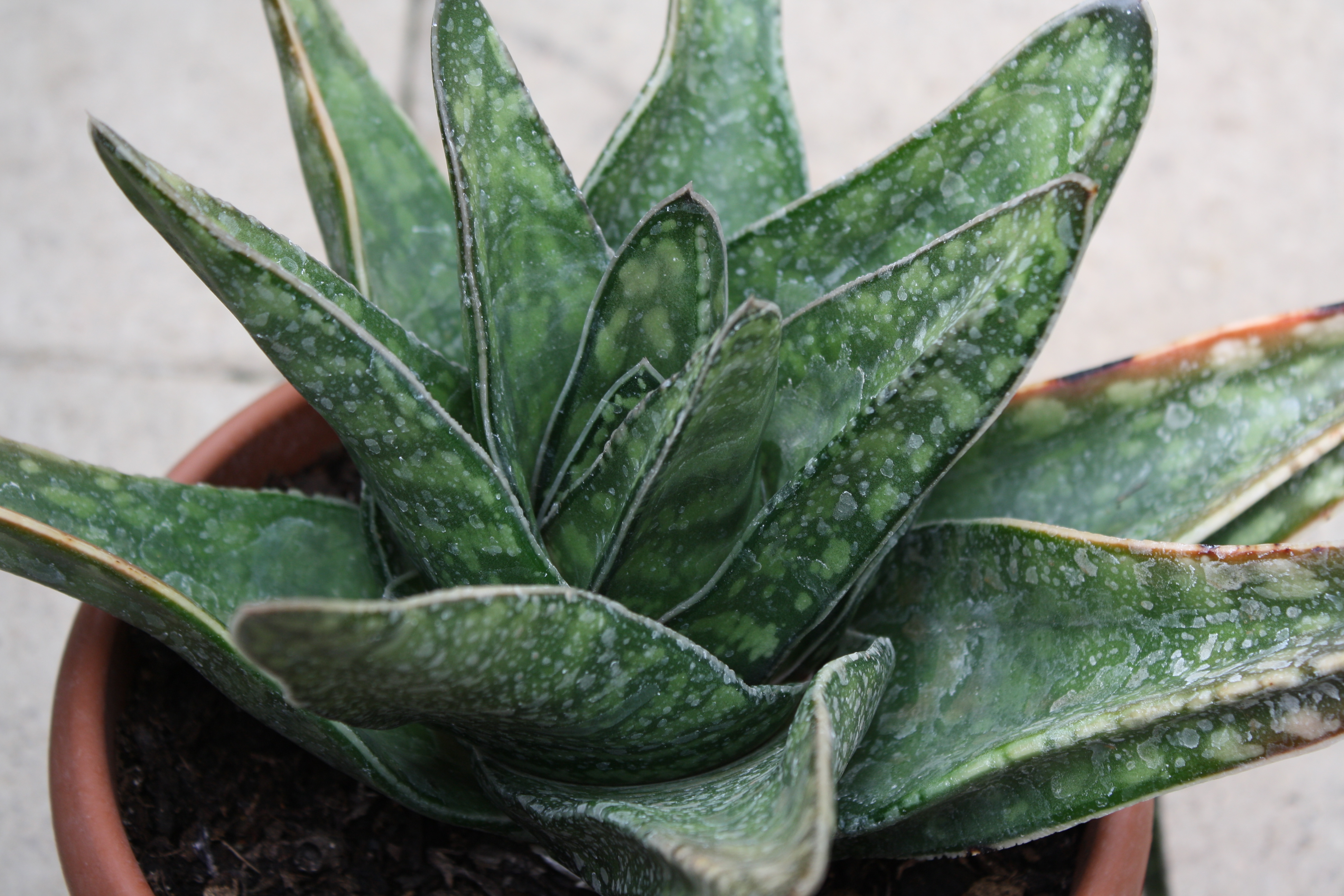 Morfoloģija. Mūžzaļš, daudzgadīgs, sukulents ar biezām, cietām, uz augšu vērstām, spirālveida rozetē sakārtotām lapām 40-50 cm diametrā un 20-24 cm garumā. Lapas zaļas, gludas, ar lieliem, gaišiem plankumiem. Bagātīga sakņu sistēma ar resnām, gaišām un īsām saknēm. Pie sakņu kakla veido jaunos dzinumus. Ziedkāts 50-60 cm garumā. Saliktajā ziedkopā pelēkrozā „kuņģa izskata” ziedi. Zied pavasarī.