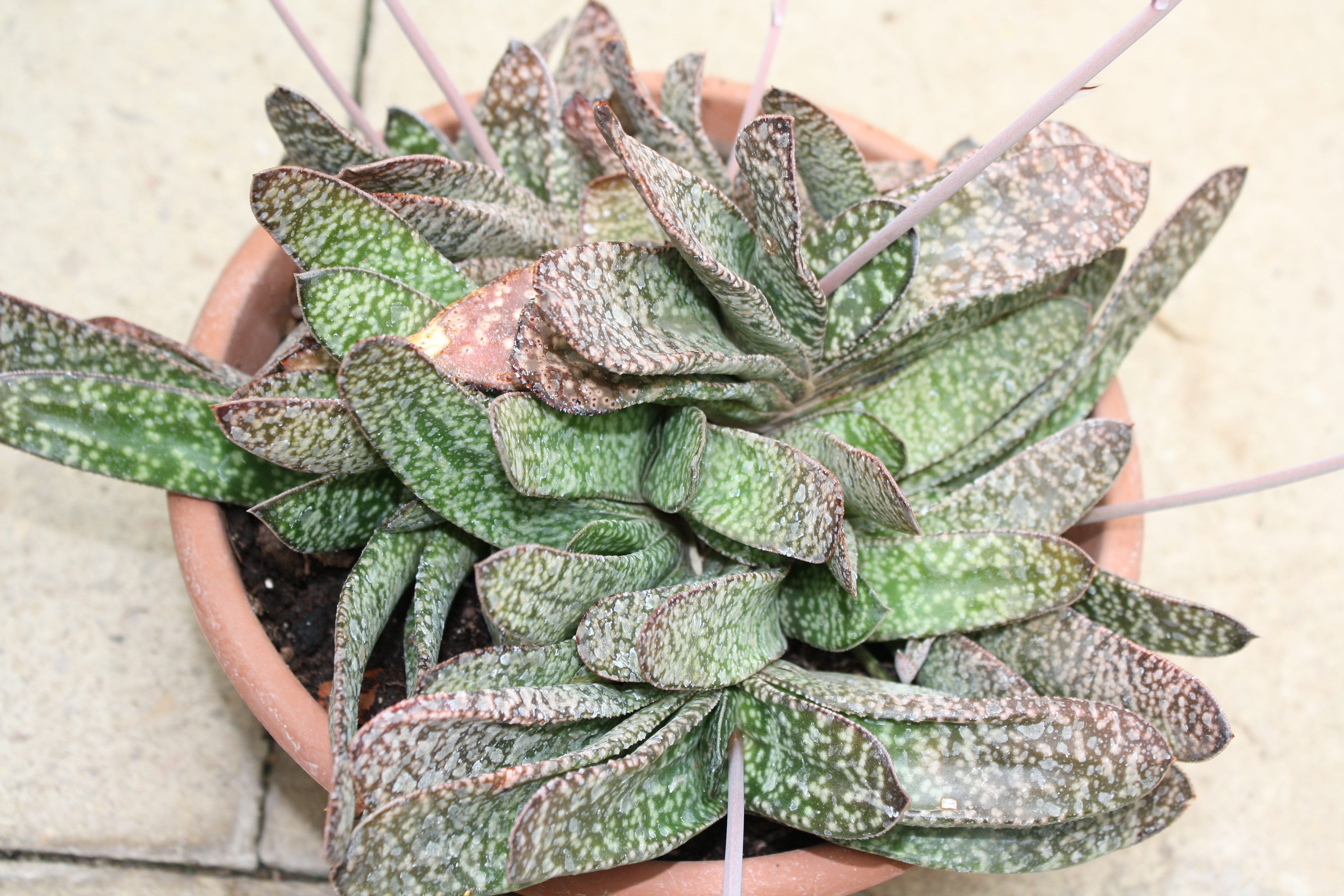 Morfoloģija. Mūžzaļš, daudzgadīgs, sukulents ar biezām, divās, pretējās, simetriskās rindās, spirālveida sakārtotām lapām līdz 20 cm garumā. Lapas gaiši zaļas, apaļas, biezi klātas ar sīkiem, baltiem punktiem, kuri mēdz saplūst. Lapas iemalotas brūnsarkanas. Lapu gali apaļi, ar nelielu spici, krāsojas brūni. Bagātīga sakņu sistēma ar resnām, gaišām un īsām saknēm. Zied pavasarī ar vārpā saliktiem rozā „kuņģa izskata” ziediem. Bagātīgi veidi dzinumus.