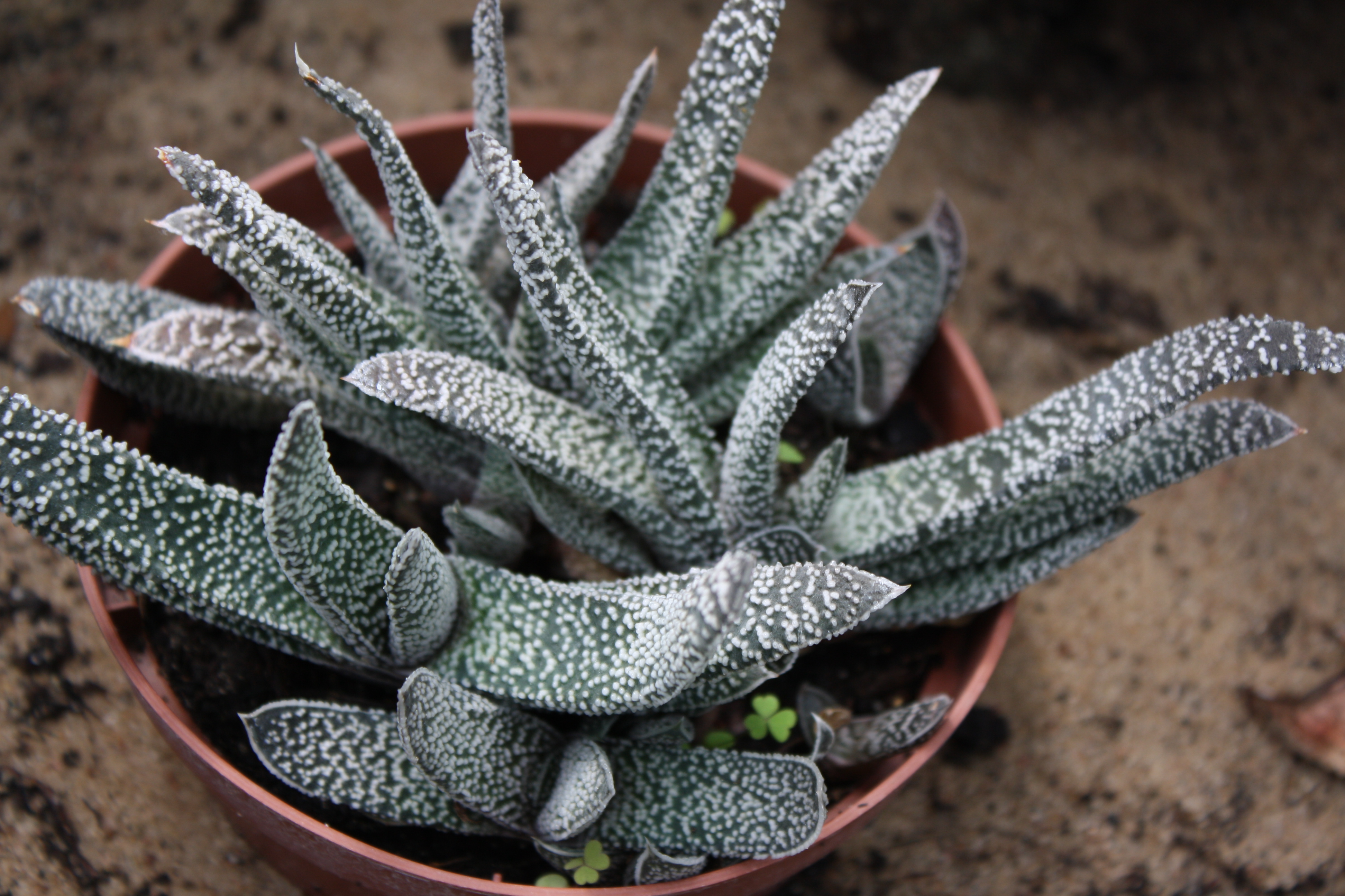 Morfoloģija. Mūžzaļš, daudzgadīgs, daudzdzinumu sukulents ar biezām, divās, pretējās, simetriskās rindās sakārtotām lapām 6-10 cm garumā un 1-1,5 cm platumā pie pamatnes. Lapas tumši zaļas, kantainas, biezi klātas ar sīkām, baltām, atstāvošām kārpiņām, kuras ļoti biezā kārtā ir spico lapu galos. Bagātīga sakņu sistēma ar resnām, gaišām un īsām saknēm.