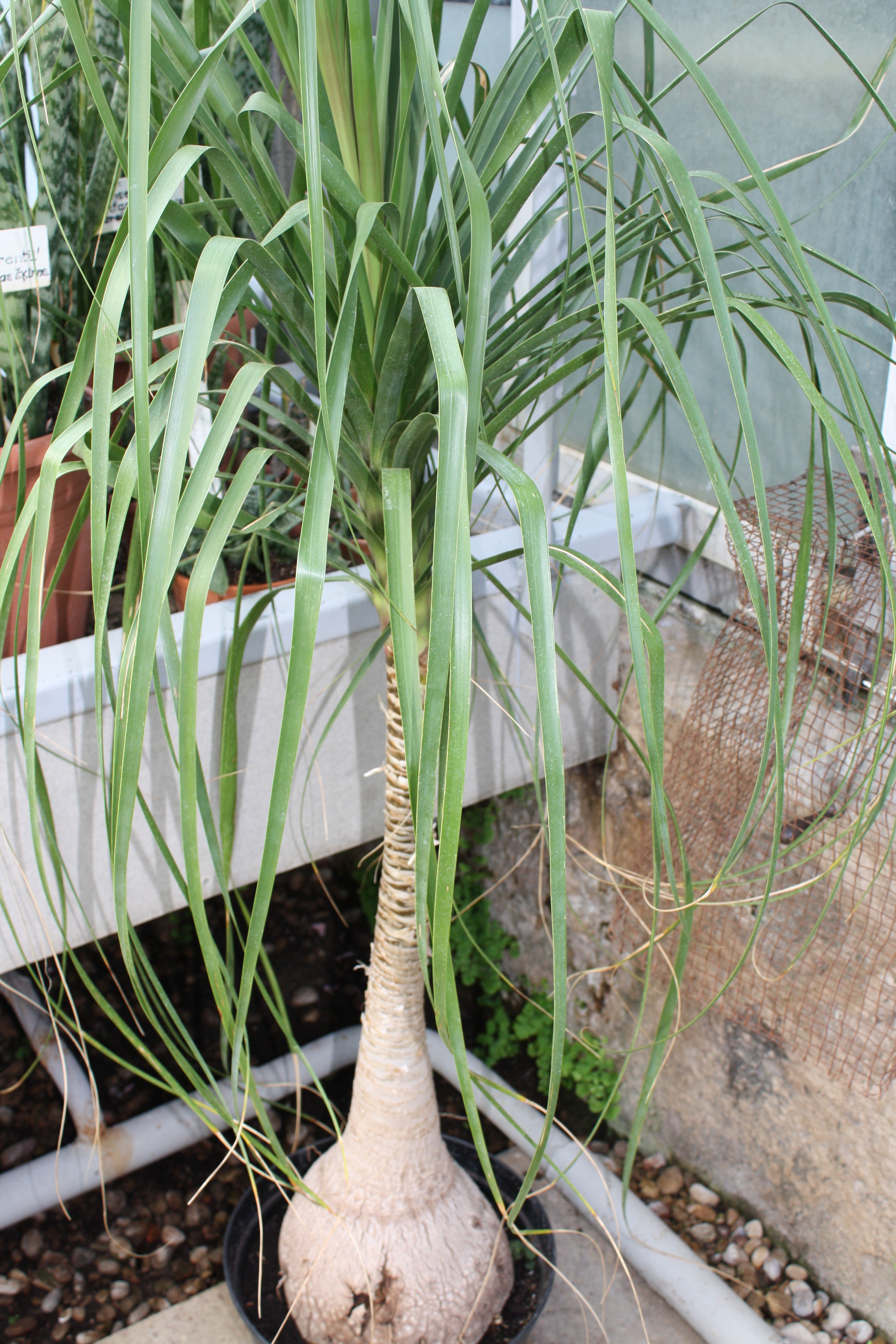 Morfoloģija. Mūžzaļš, daudzgadīgs lakstaugs-sukulents ar pudeles izskata stumbru. Resnais stumbrs bez lapām, tās sakārtotas dzinuma galotnē un ap to. Lapas 1,5 cm platas un 60-80 cm garas ar spicu galu. Zaļās, cietās, lapas ar asām malām atliekušās no stumbra. Telpās izaug vairāk nekā 2 metrus gara. Spēcīga sakne. Telpās nezied vai ārkārtīgi reti.