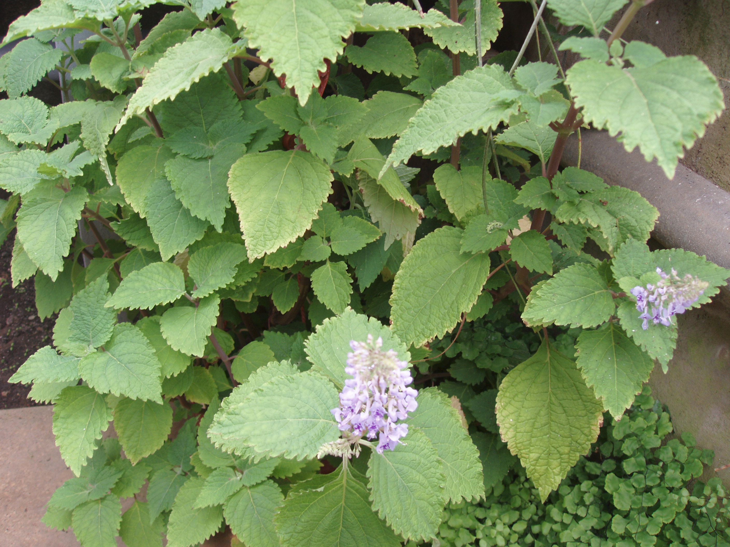Morfoloģija. Mūžzaļš, daudzgadīgs, augstumā ap 80 cm, daudzzarains un vertikāli stāvošs krūms ar sirdsveida, palielām, gaiši zaļām lapām, kuru virspuse noklāta sīkiem, smalkiem matiņiem. Lapām īpatnēja smarža. Lapu apmale ir divkārši zobaina. Ziedi gaiši zili, pagarās vārpās. Zied vasarā, rudenī.