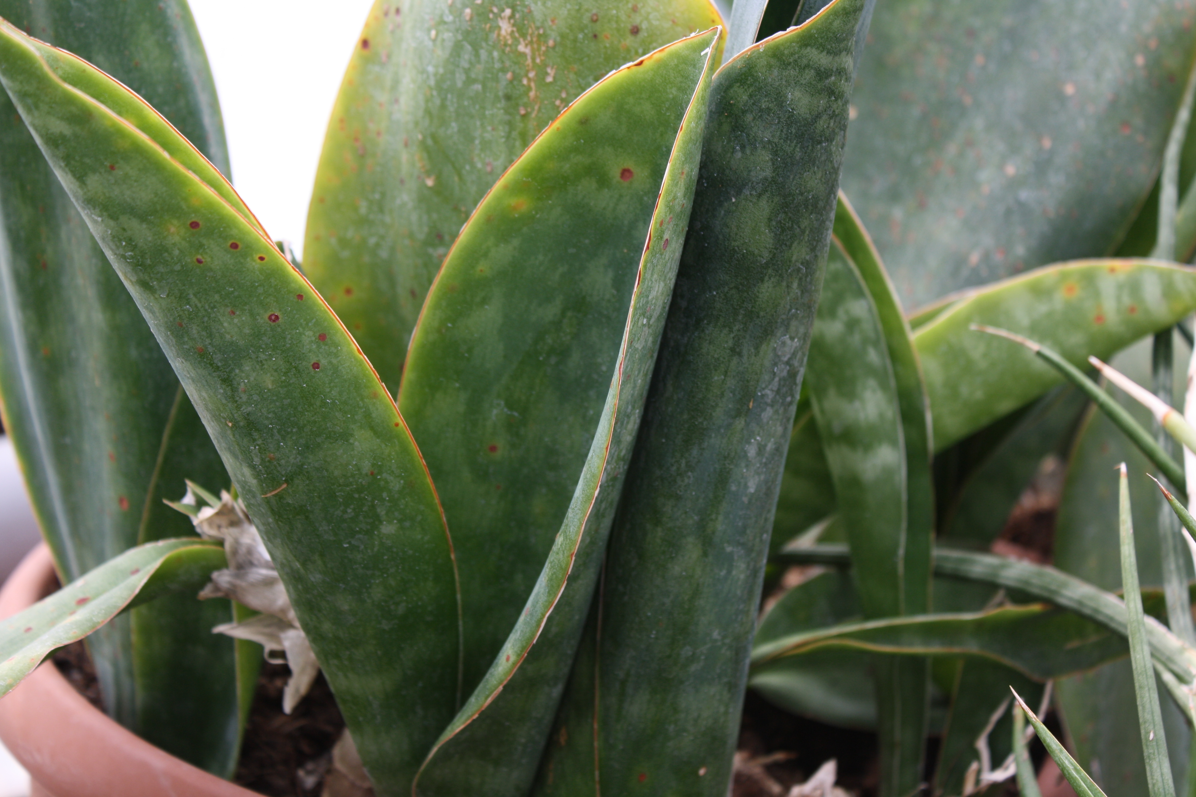 Morfoloģija. Mūžzaļš, daudzgadīgs lakstaugs – sukulents, 40-50 cm augsts ar resniem, gaļīgiem, bet trausliem sakneņiem, no kuriem attīstās lielas, biezas, ādainas, tumši zaļas, ovālas lapas, kuras klātas baltiem plankumiem. Lapu malas iekrāsojas sarkanbrūnas. Lapu gals spics. Zied ziemā ar stingru, vertikāli stāvošu vārpu, kura uzzied ar baltiem, nelieliem, smaržīgiem ziediņiem. Spēcīga sakne, kura augot var pārplēst māla podu.