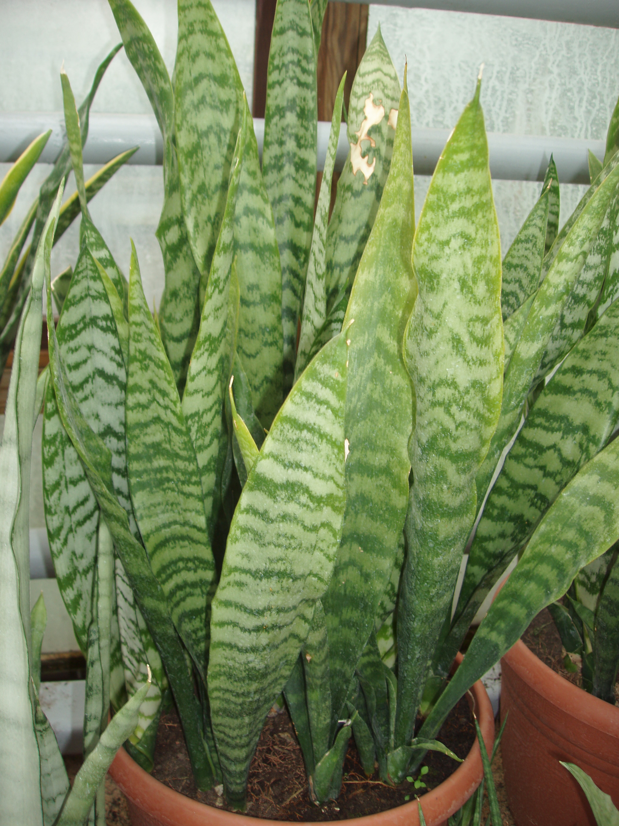 Morfoloģija. Mūžzaļš, daudzgadīgs lakstaugs - sukulents līdz 1 metru garām lapām. Šķēpveida, stingrās, vertikālās, ādainās, tumši zaļās lapas abās pusēs ar gaišām šķērssvītrām. Lapu gals spics. Zied ziemā ar stingru, vertikāli stāvošu vārpu, kura uzzied ar baltiem, nelieliem, smaržīgiem ziediņiem. Ziedi nepaceļas virs lapām. Spēcīga sakne, kura augot var pārplēst māla podu.