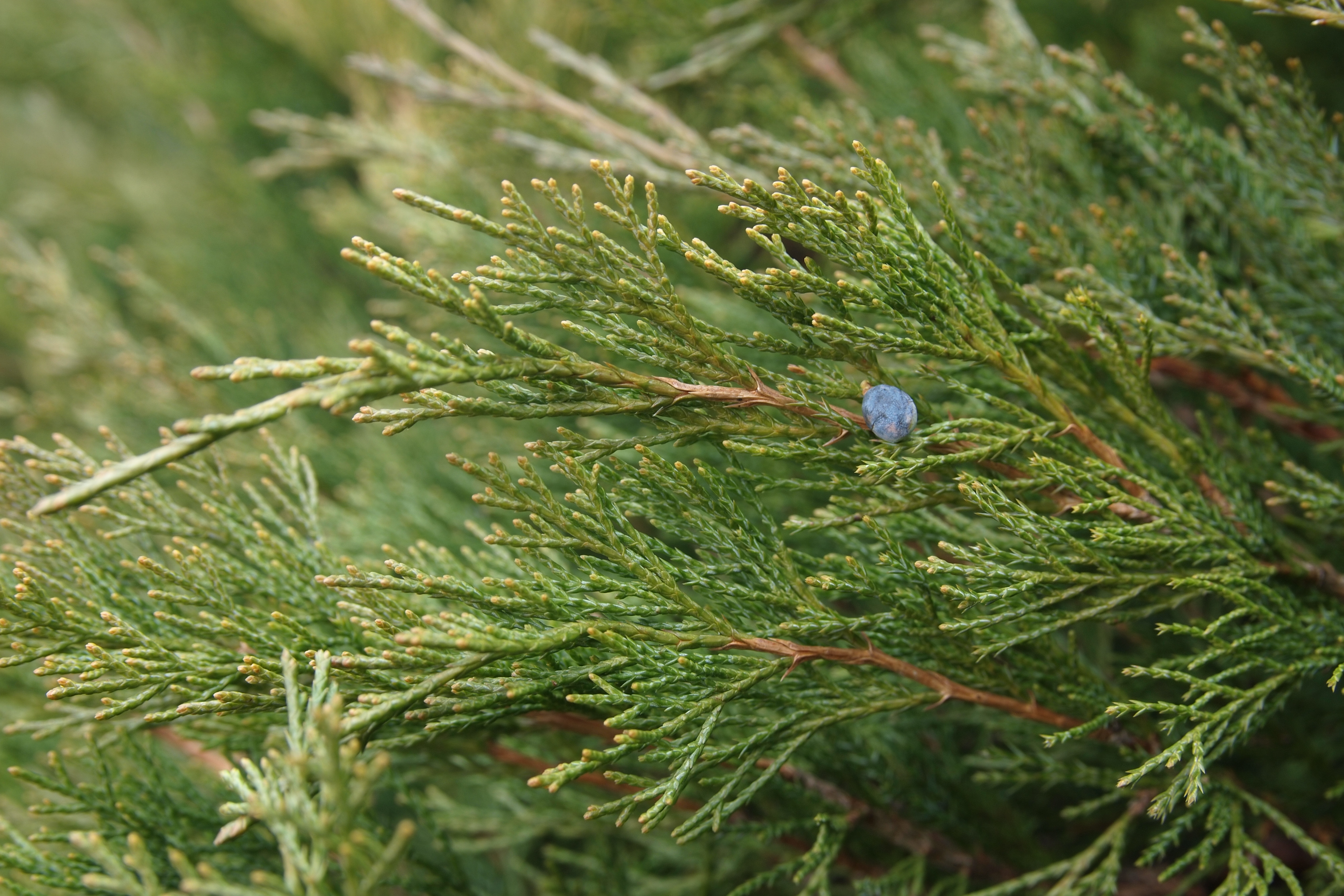 Morfoloģija. Morfoloģiski daudzveidīga suga. Biežāk sastopami ir ap 0,6 m augsti krūmi ar gariem, gulošiem līdz paciliem zariem. Retāk - nelieli, līdz 4 m augsti koki. Miza sarkanbrūna, zvīņaina. Skujas līdz 10 gadu vecumam adatveida, atstāvošas, taisnas, līdz 4 mm garas, zilganzaļas, ar izteiktu gaišu atvārsnīšu joslu virspusē; vēlāk skujas zvīņveida, blīvas, pretējas, 1-3 mm garas, strupas, tumši zaļas. Tām raksturīga spēcīga, asa smarža. Divmāju augs. Apputeksnējas maijā. Čiekurogas ar izteiktu kātiņu, 5-7 mm platas, apaļas vai olveida, brūnganas, ar zilganu apsarmi, nogatavojas 18 mēnešu laikā. Visas auga daļas ir indīgas.