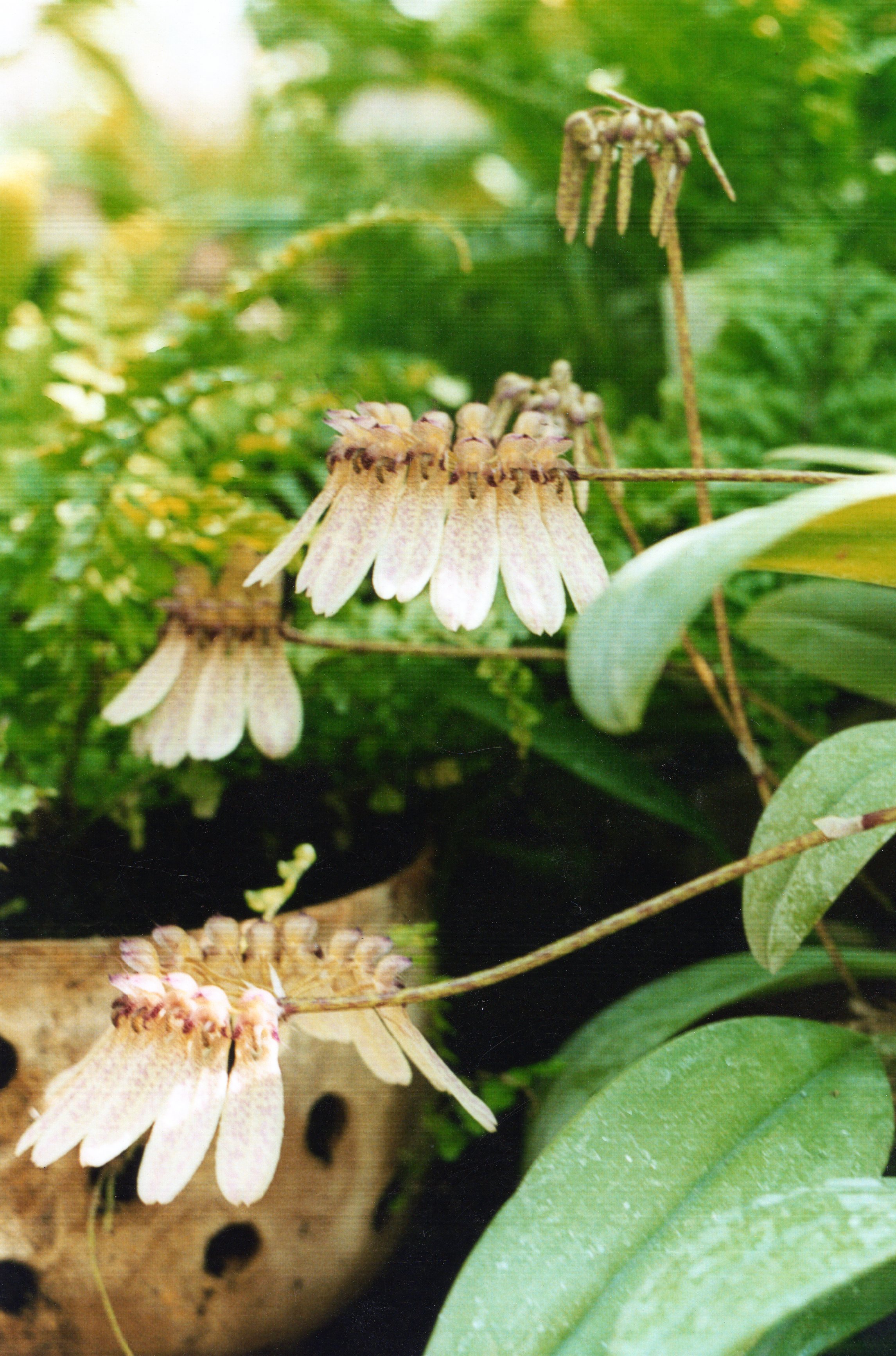 Morfoloģija. Mūžzaļa, daudzgadīga, neliela epifītorhideja, kurai ir paresnināti, olveida stumbri, katram ar vienu lapu. Kopā saauguši 9-12 olveida tuberīdiji. Saknes resnas, spēcīgas un garas. Lapas cietas, ādainas, sulīgas, gaiši zaļas, garenas ar smailu galu. Uz ziedneša 3-11 ziedi, gaiši brūnā krāsā ar lāsumiem, ar sarkanbrūnu lūpu, sakārtoti vainagveidā, ar īsu kātiņu, kas ļauj ziediem kustēties. Zied katru gadu vasaras beigās.