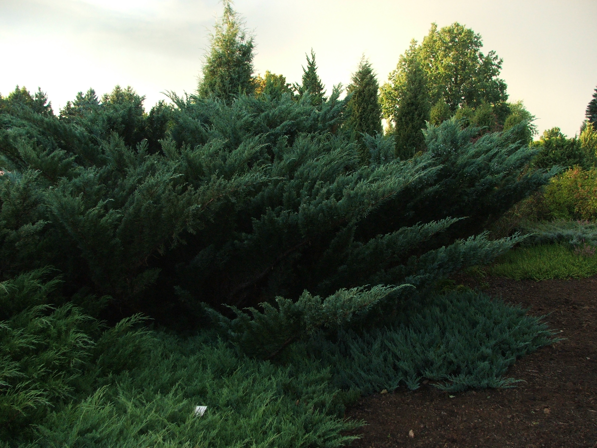 Morfoloģija. Klājenisks krūms. Sakņu sistēma sasniedz 2 m dziļumu. Vainags biezs, tā forma mainīga, augstums 0,5-2 m, diametrs 2-3 m. Dzinumi gari, blīvi zaroti. Miza pelēkbrūna, zvīņaina. Skujas zvīņveida, zilganzaļas, ovālas vai rombveida, 3-6 mm garas, saglabā krāsu arī ziemā. Uz jaunajiem dzinumiem arī cilindriskas, līdz 1 mm garas, gaiši zaļas adatveida skujas. Divmāju augs. Apputeksnējas jūlijā, nākamā gada rudenī nobriest apaļas, tumši zilas čiekurogas 5-7 mm diametrā, katrā no tām 2-3 trīsšķautņainas sēklas.