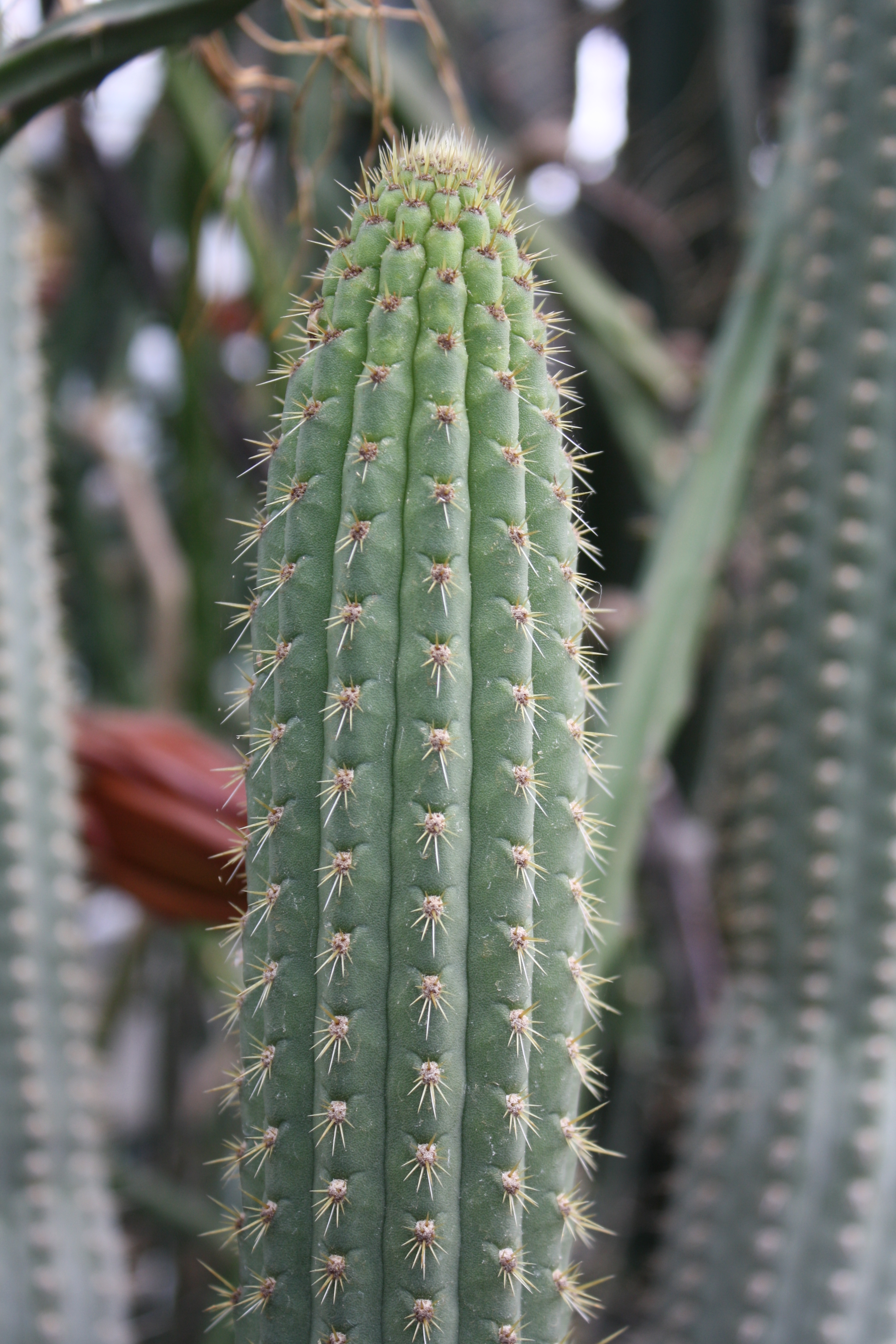 Morfoloģija. Daudzgadīgs, mūžzaļš zarains, stabveida kaktuss, kas telpās izaug 2 un vairāk metru augstumā. Stumbri pelēkzaļi, ar 14 ribām. Areolās ap 14 īsiem zeltaini dzelteniem ērkšķiem, kuri pie pamata paresnināti. Ziedi attīstās stumbra sānos, tuvāk galotnei, 5 cm gari, trubveida, balti ar zaļganu vai rozā nokrāsu. Zied jūnijā, jūlijā. Spēcīga, plaša bērkšsakne.