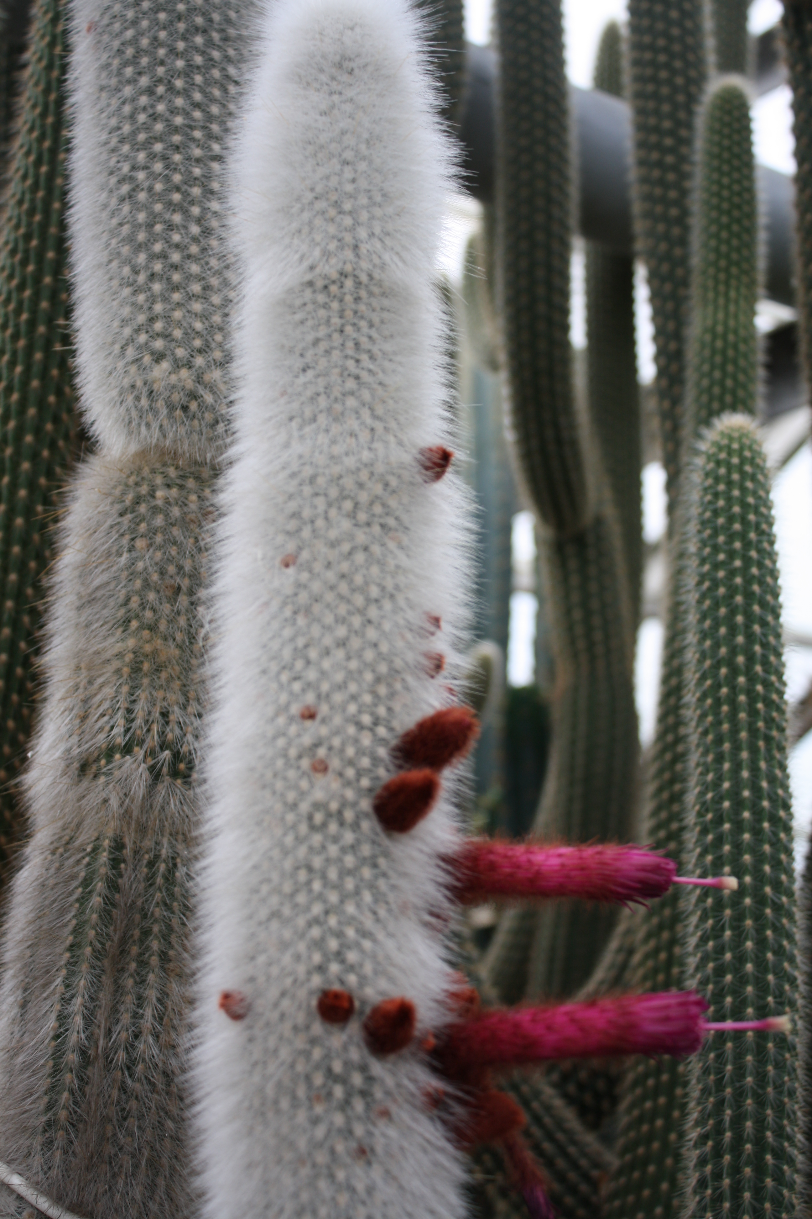 Morfoloģija. Daudzgadīgs, mūžzaļš vienstumbra, stabveida, pelēkzaļš kaktuss, kas telpās sasniedz 2 un vairāk metru garumu. Stumbra diametrs 5-7 cm. Var pie pamata zaroties, veidojot dzinumus. Stumbri blīvi klāti ar baltiem, sarveida ērkšķiem. Ap 25 ribām. Ērkšķi īsi, 2 cm gari, gaiši dzelteni, vērsti uz leju. Ziedi attīstās sānos, tuvāk galotnei. Ziedi 8 cm gari, trubveida, spilgti sarkani. Zied maijā – jūlijā.