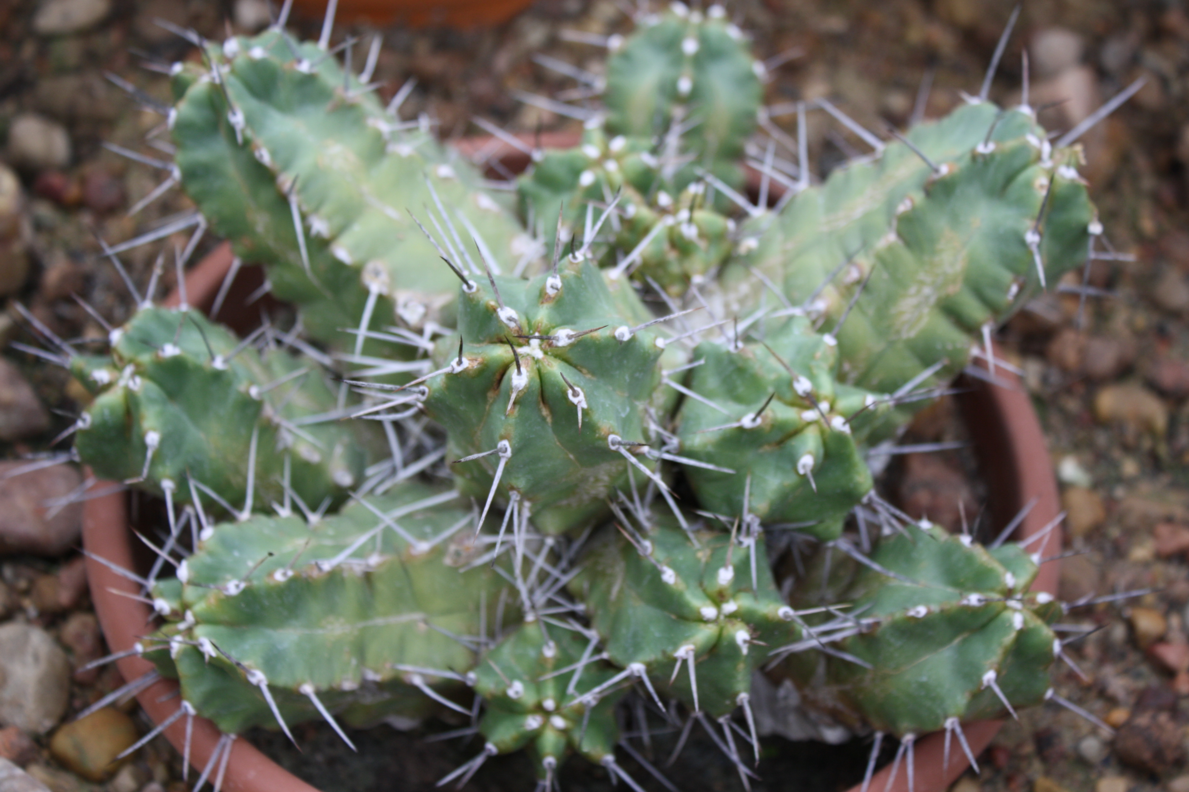 Morfoloģija. Daudzgadīgs, mūžzaļš, pelēkzaļu, šķautņainu, neizteikti cilindrisku stumbru kaktuss, kas telpās izaug 20-30 cm garš un 10 -12 cm augsts ar cietiem, taisniem, asiem ērkšķiem, kuri ir nedaudz. Viens augs sastāv no 3-5 stumbriem. Ziedam piltuves forma, 8-9 cm diametrā, sarkanā krāsā. Zied pavasarī, vasarā. Spēcīga bārkšsakne.