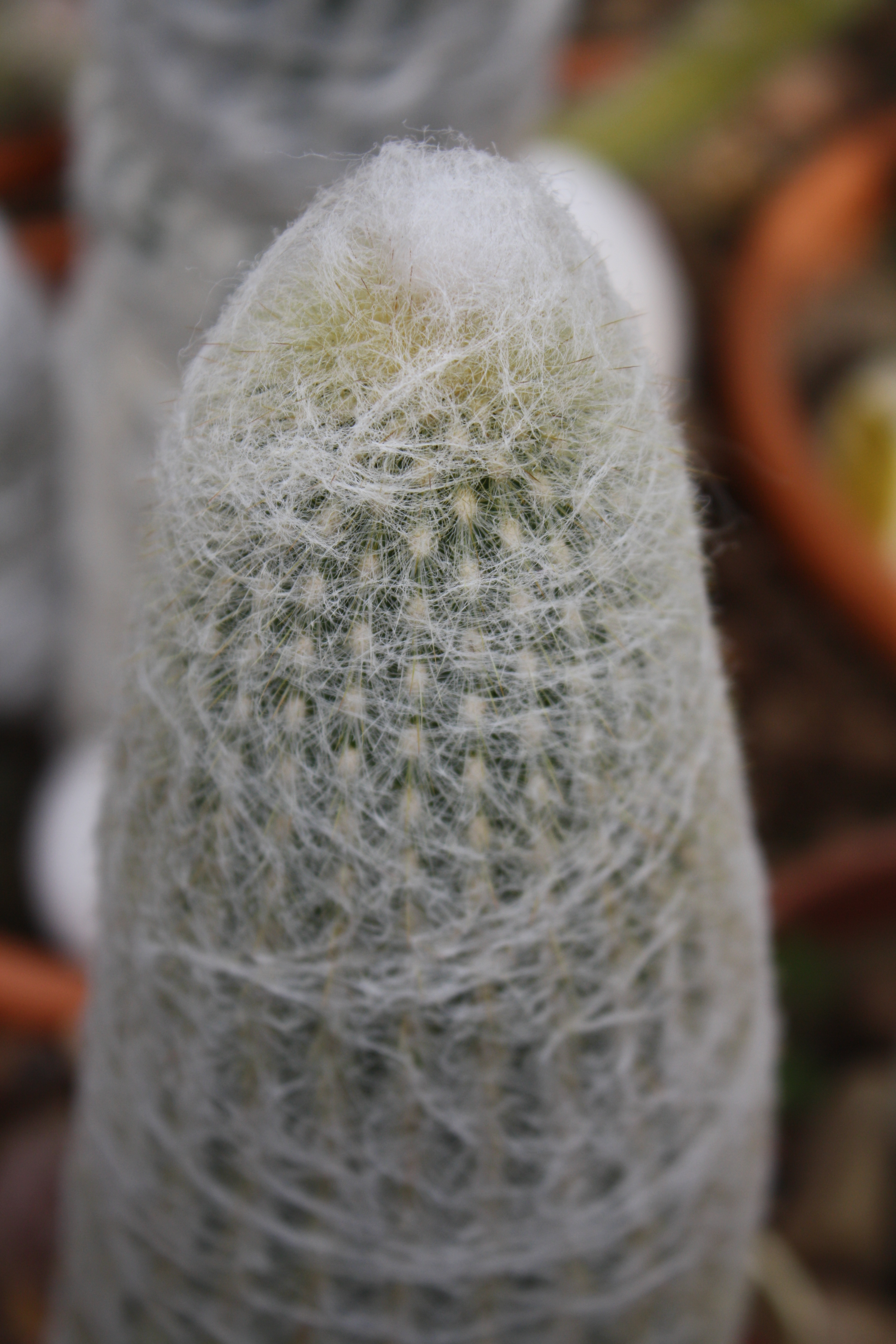 Morfoloģija. Daudzgadīgs, mūžzaļš, īss stabveida kaktuss, kas telpās izaug 1 m garumā. Pieauguši kaktusi, veido svečturveida zarojumu, atšķiras no sējeņiem, kuriem ir viens stabveida stumbrs, kuru apņem gara, balta vai dzeltenīga, mīkstu, zīdainu matiņu tīklveida sega, kurai cauri izaug adatveida dzelteni vai brūni ērkšķi. Ribas 20-30, zemas, taisnas. Areolas blīvi klātas bieziem, baltiem matiem. Ziedi 3 cm diametrā, 5 cm gari, balti ar gaiši rozā nokrāsu. Telpās zied reti.