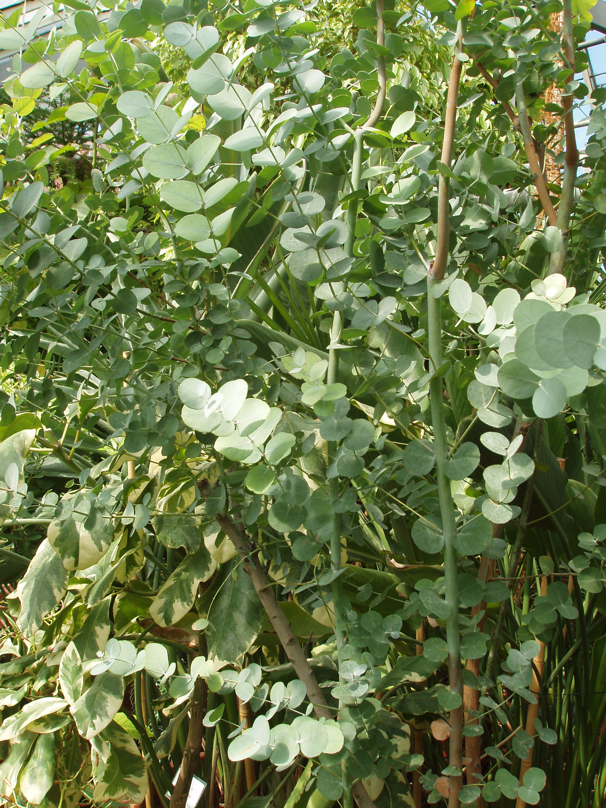 Morfoloģija. Mūžzaļš, daudzgadīgs 2-3 metrus augsts, ne pārāk kupls krūms telpās. Lapas, nelielas, pamīšus sakārtotas, sudrabaini zilganzaļas, cietas. Jaunajiem augiem lapas mazas, apaļas, vecākajiem lapas lancetiskas, pat līdz 12 cm garas. Stumbri, zari zilganā krāsā. Spēcīga bārkšsakne. Telpās nezied. Eikalipti satur stipri smaržojošu ēterisko eļļu.