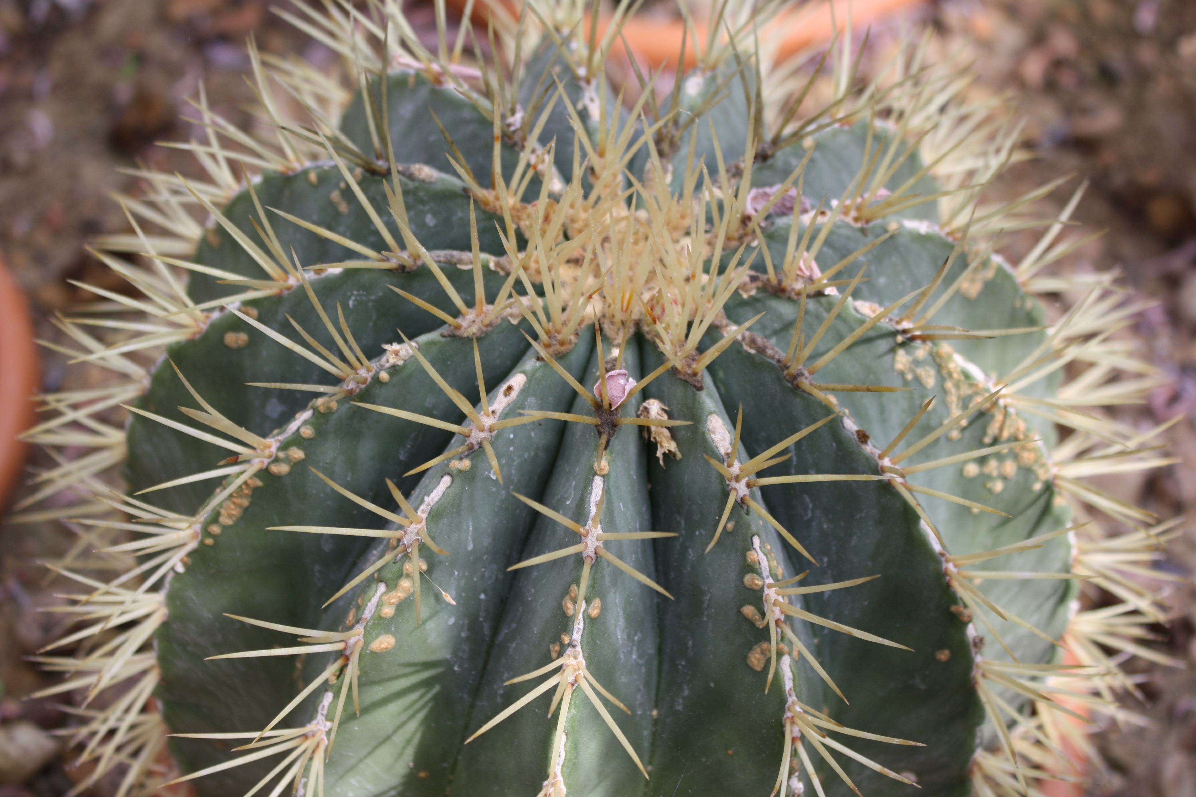 Morfoloģija. Daudzgadīgs, mūžzaļš kaktuss ar zilganzaļu, lielu, apaļu, vēlāk cilindrisku stumbru, kuru sedz samtaina epiderma. Ribas 13, augstas, paugurainas. Pelēkbaltās areolās 6-8 malējie ērkšķi, 1 masīvs, centrālais ērkšķis. Visi ērkšķi gaiši dzelteni, 2-3 cm gari. Zied veci kaktusi galotnē ar dzelteniem ziediem. Telpās zied reti.