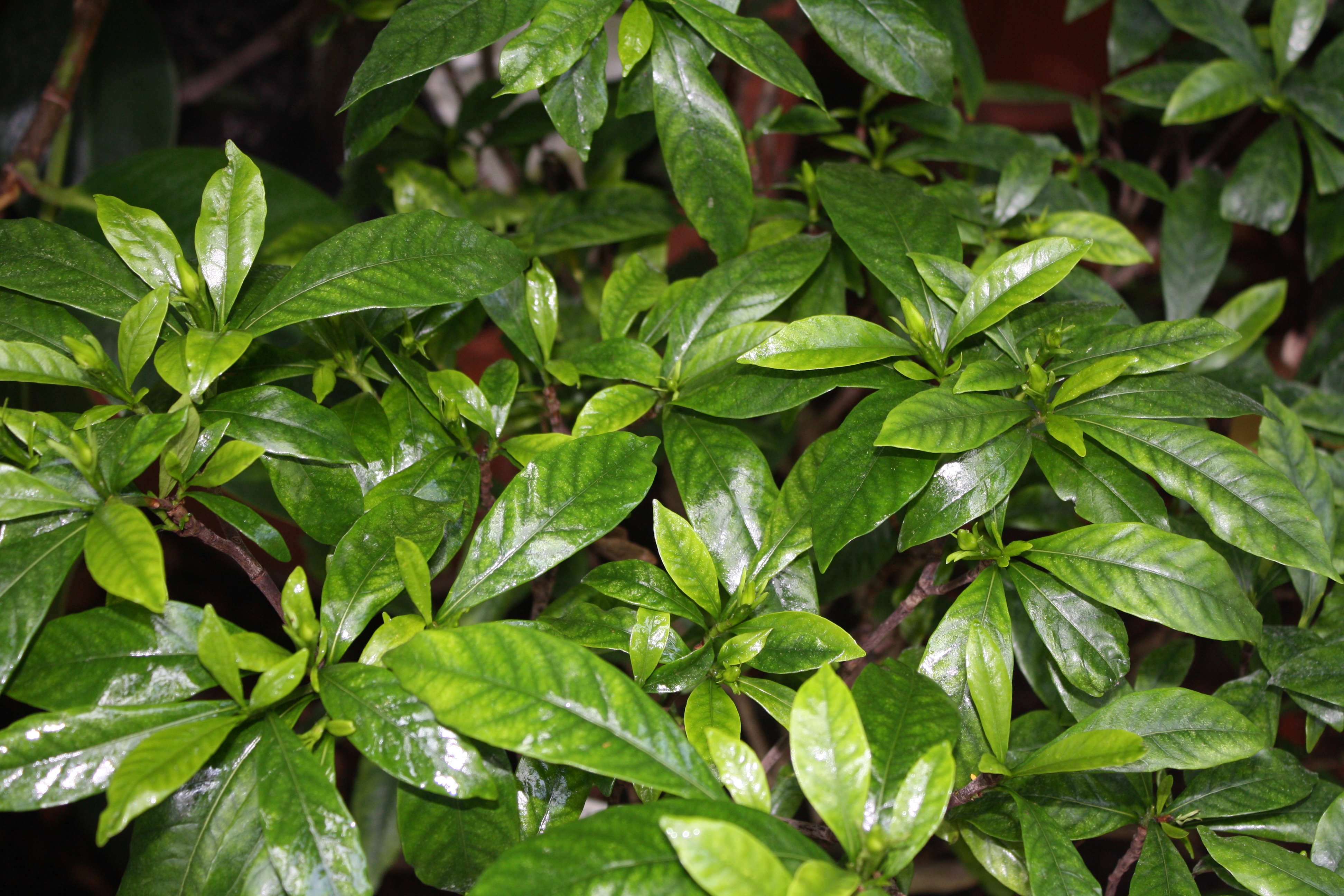 Morfoloģija. Mūžzaļš, daudzgadīgs biezi zarots un lapots krūms, reti koks, kurš telpās izaug 60-80 cm augsts. Lapas virspuse tumši zaļa, apakšpuse gaiši zaļa. Lapa 8-12 cm gara, 3-4 cm plata, gareniski ovālas, ar spicu galu, spīdīgas, ādainas. Ziedi koši balta, aromātiski, klaji, 3-5 cm diametrā, veidojas pa vienam lapu žāklēs vai zaru galotnēs. Zied pavasarī un rudenī. Spēcīga bārkšsakne.