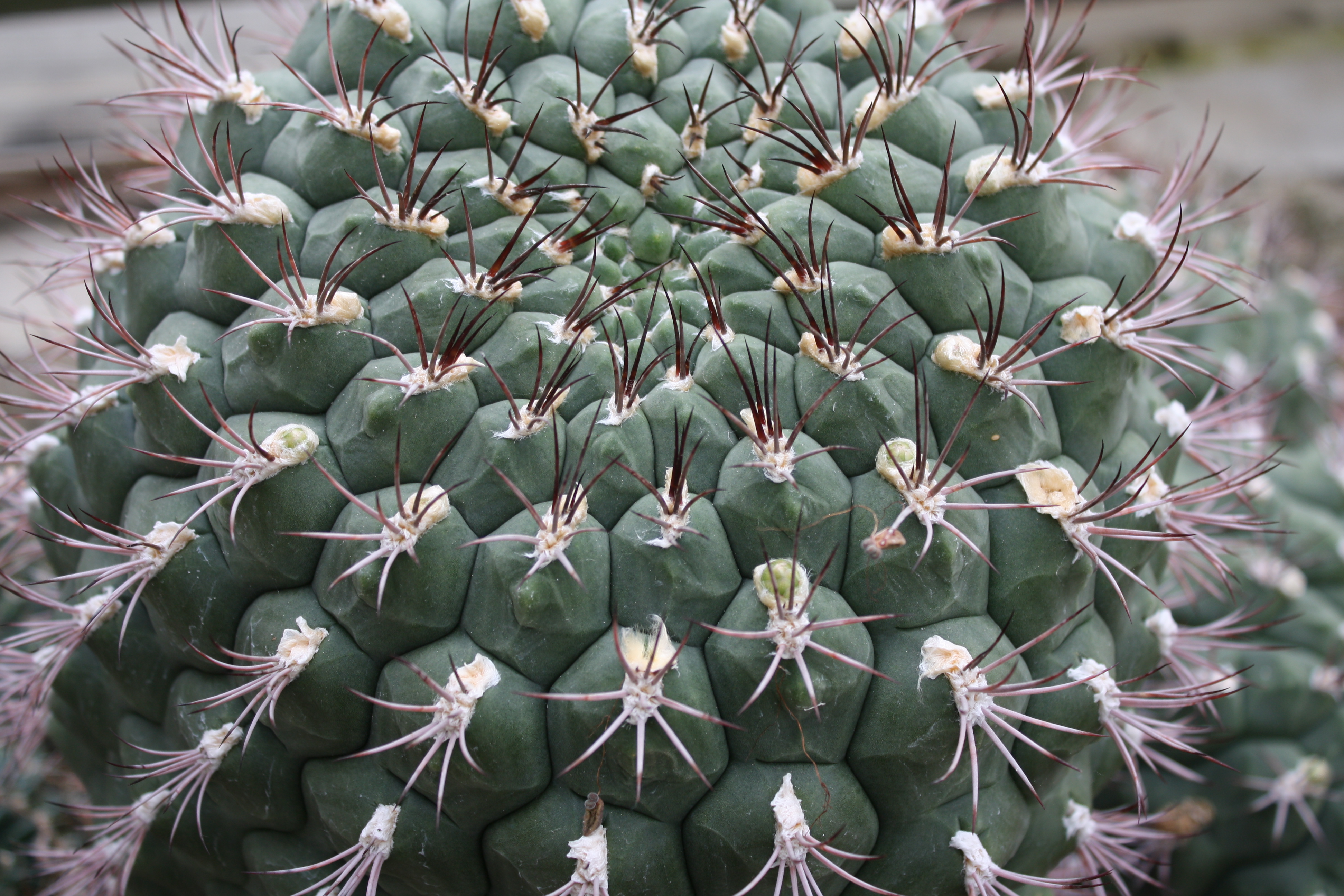 Morfoloģija. Daudzgadīgs, mūžzaļš, gaiši zilganzaļš, liels, apaļas formas, no augšas nedaudz saplacināts, kaktuss, kuram ļoti reti veidojas sānu dzinumi. Telpās izaug 20-30 cm diametrā. Stumbrs ar 13-30 ribām, kuras ar šķērsvagām sadalītas lielos, apaļos pauguros. Cieti, izliekti 8-17 sānu ērkšķi 2-4 cm garumā un 1-2 centrālie ērkšķi. Visi ērkšķi cieti, spēcīgi, sarkanbrūni līdz melni, nedaudz atliekti. Zied vasarā. Ziedi balti vai maigi rozā, 3-4 cm gari un 3-4 cm diametrā.