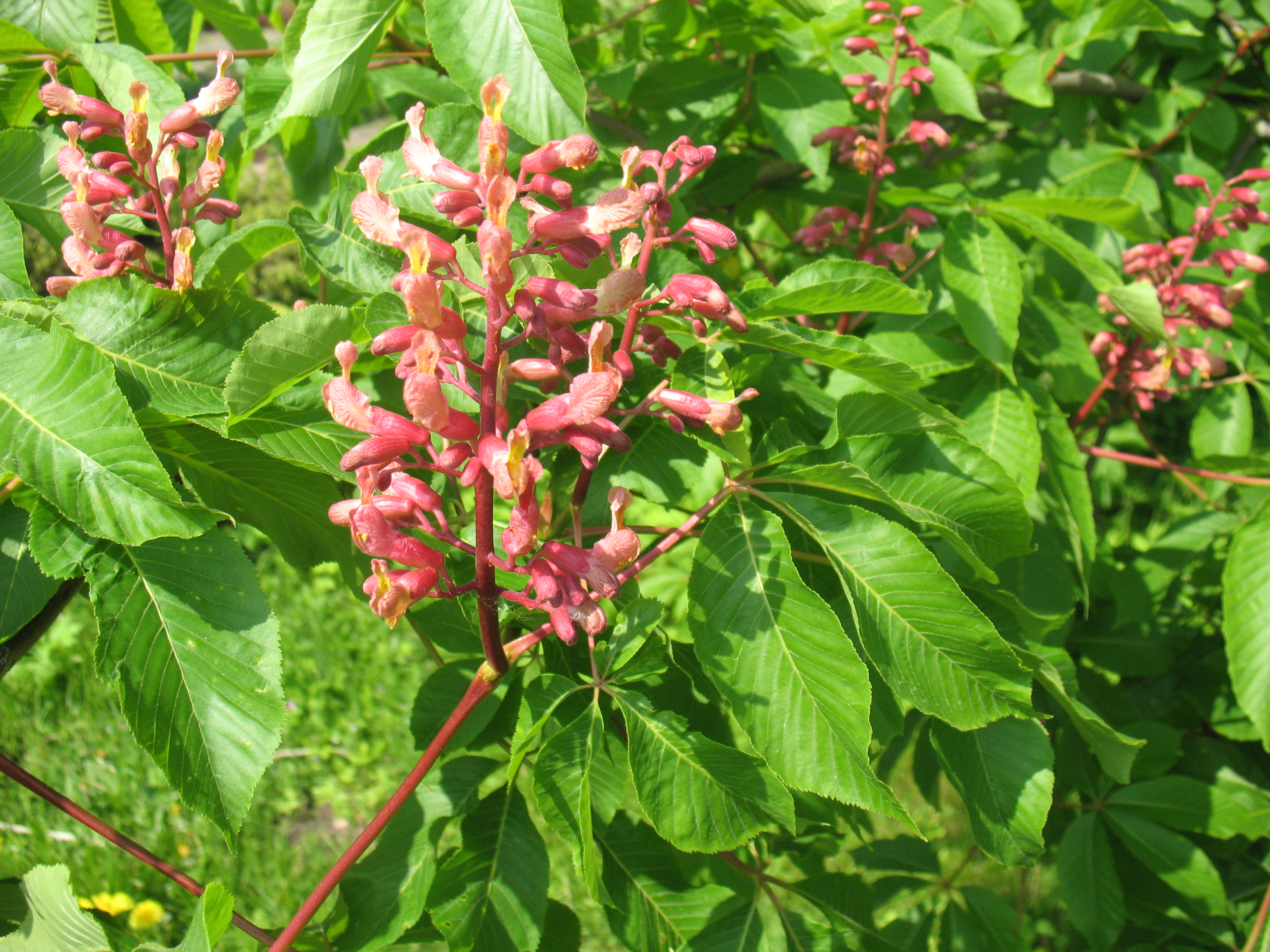 Morfoloģija. Vasarzaļš vidēja lieluma koks. Lapas staraini saliktas no piecām lapiņām, tās otrādi iegareni olveida, virspusē spožas, tumši zaļas, apakšpusē ar matiņiem uz dzīslām, nosmailotas, ar smalki zāģzobainām malām, 10-15 cm garas. Ziedi 10-16 cm garās skarās, dzelteni un sarkanīgi. Ziedkāts un kauslapas dziedzerainas. Putekšņlapas īsākas kā vainaglapas, pie pamata tūbainas. Zied maijā, jūnijā. augļi apaļi, gludi, ienākas septembrī.