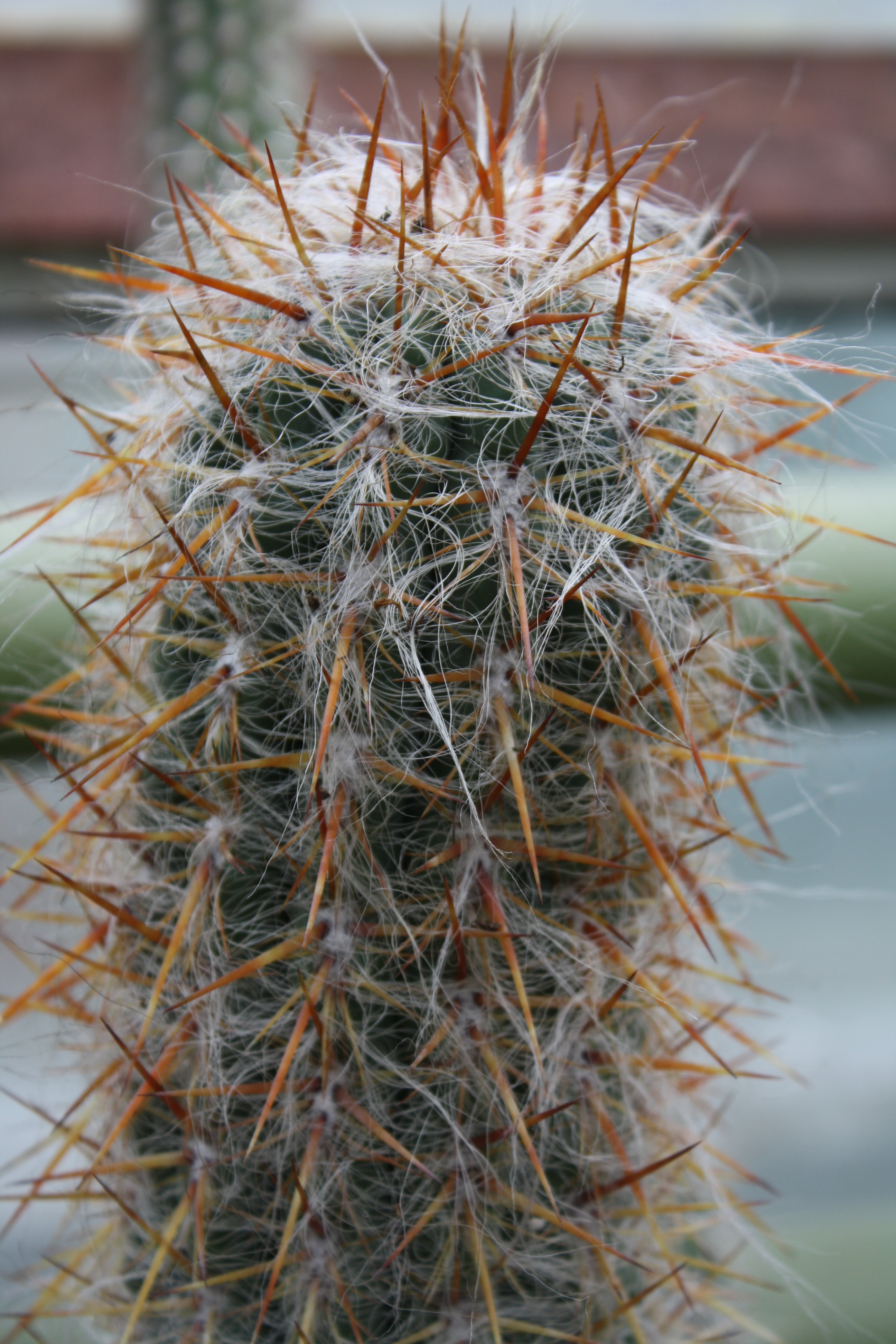 Morfoloģija. Daudzgadīgs, mūžzaļš, garš, stabveida kaktuss, kurš maz veido sāndzinumus. Telpās izaug ap 50 cm garumā un 15-20 cm diametrā. Stumbrs ar 15-20 zemām, apaļām ribām. Areolas nelielas, tuvu izkārtotas, kurās ir daudz baltu, spožu matiņu 4-7 cm garumā, kuri blīvi nosedz visu habitusu. Sānu ērkšķi 10-15, 1-2 cm gari un 1-3 centrālie ērkšķi 3 cm gari. Visi ērkšķi dzelteni līdz sarkanīgi brūni, taisni, cieti. Ziedi karamīnsarkani, 4 cm gari. Telpās zied reti, jo jāsasniedz attiecīgais lielums.