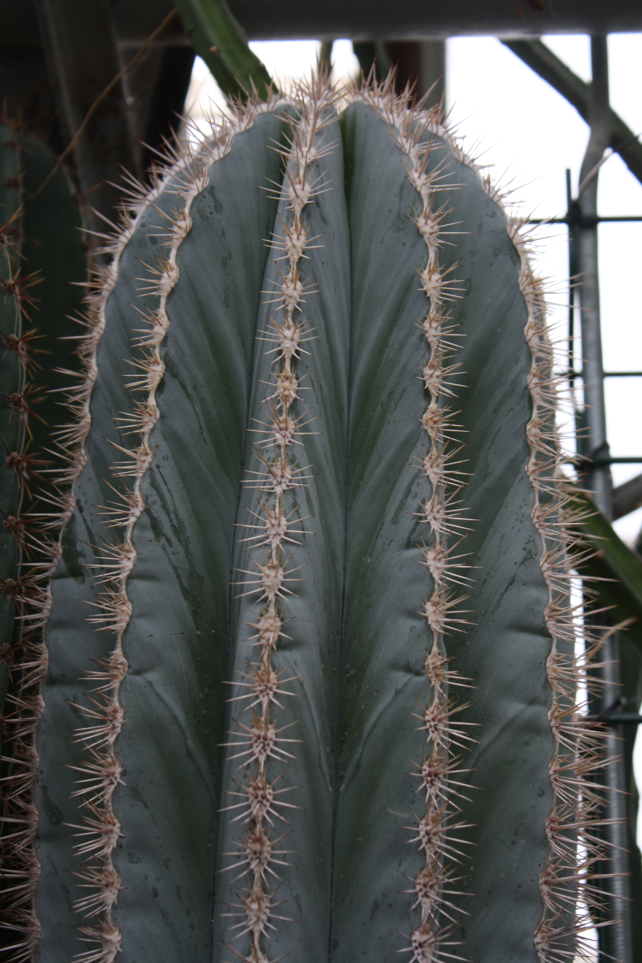 Morfoloģija. Daudzgadīgs, mūžzaļš, liels, resns, ar pelēku apsarmi, stabveida kaktuss, kurš veido daudz paralēli izvietotu sāndzinumu. Telpās izaug ap 2 m garumā un 20-30 cm diametrā. Stumbrs ar 10-13 augstām ribām. Areolas tuvu izkārtotas. Ērkšķi 15-25, balti ar melnu galu, ļoti cieti, līdz 2 cm gari, ziedēšanas zonā ērkšķu nav. Ziedi balti, 7-8 cm gari. Telpās zied reti, jo jāsasniedz attiecīgais lielums.