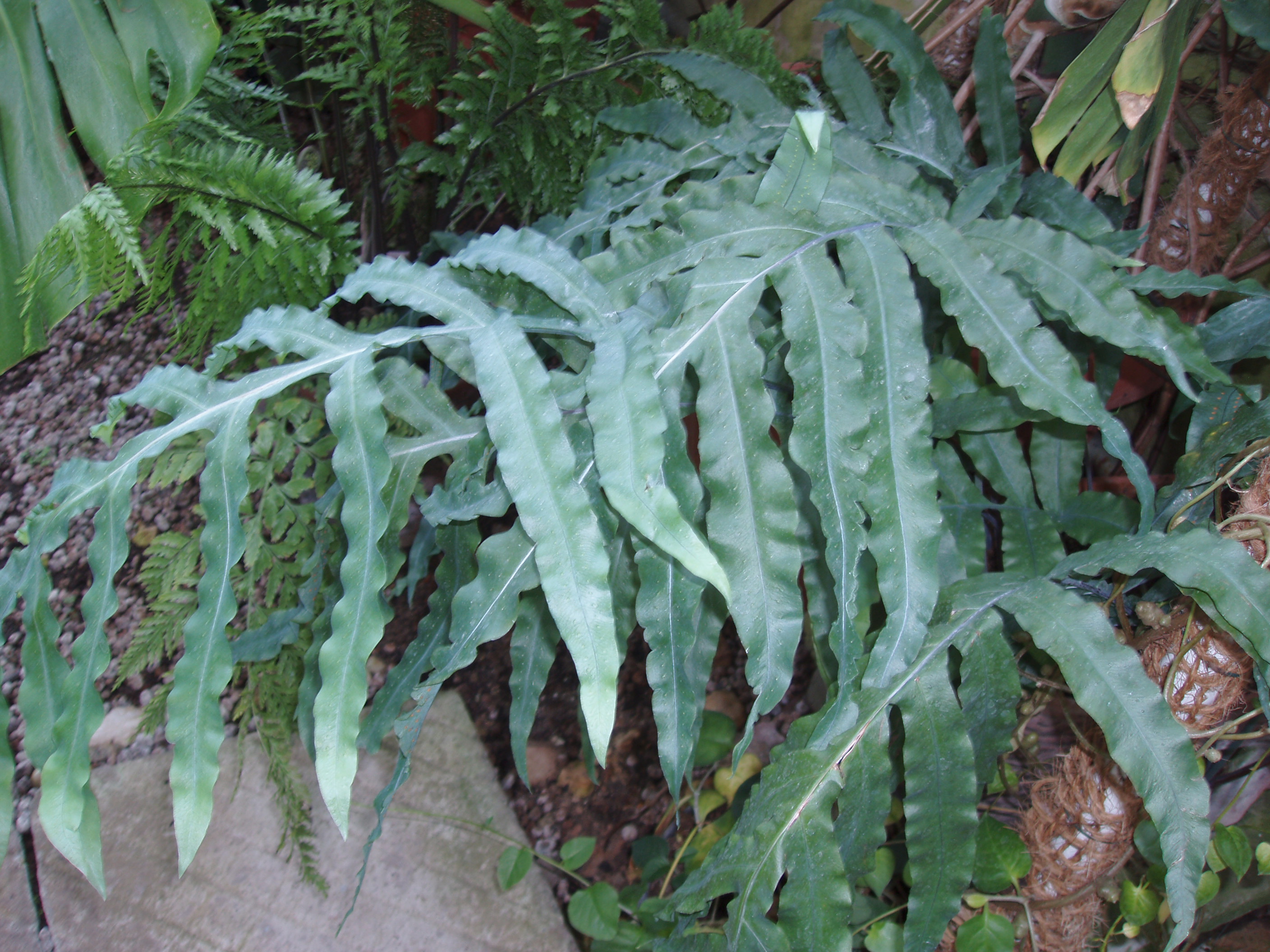 Morfoloģija. Mūžzaļa, daudzgadīga epifītpaparde, kuras lapas telpās var izaugt 80-130 cm augstumā. Aug arī uz zemes. Raksturīgi resni, sīku, zeltaini brūnu matiņu un zvīņu klāti, sulīgi, zaroti sakneņi, kuri pa pusei atrodas virs zemes. Lapas garos kātos. Zilgani apsarmotās lapas plūksnaini dalītas, izkārtotas divās rindās. Lapas plātne 40-60 cm gara.