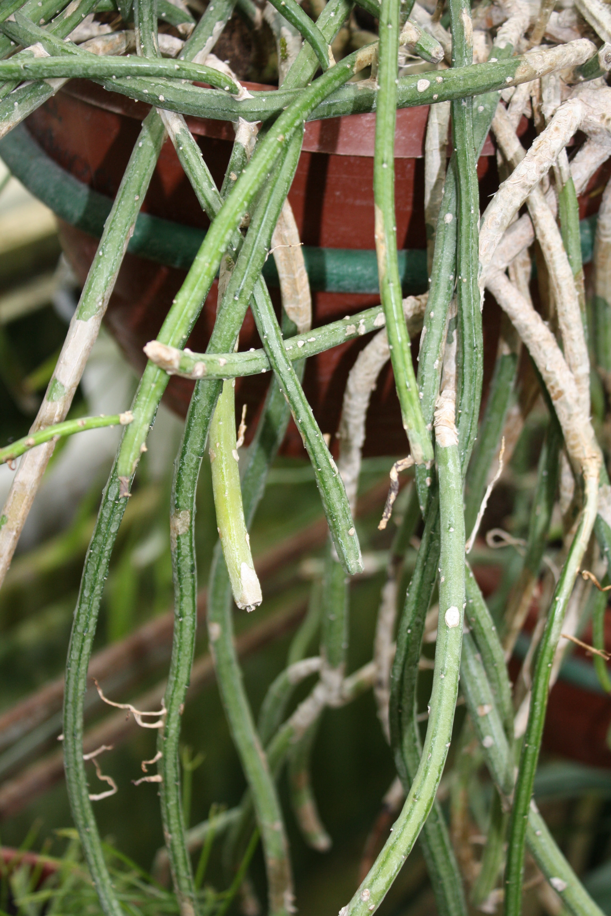 Morfoloģija. Mūžzaļš, daudzgadīgs, biezi zarots epifītkaktuss ar gariem, tumši zaļiem, stingriem, cietiem, taisniem, septiņstūrainiem stumbriem 0,8-1,5 cm diametrā, kuri telpā izaug 5o- 60 cm gari. Areolas izkārtotas reti, ar ļoti maziem, īsiem, mīkstiem ērkšķiem. Veido daudz gaisa saknes. Telpās zied reti.