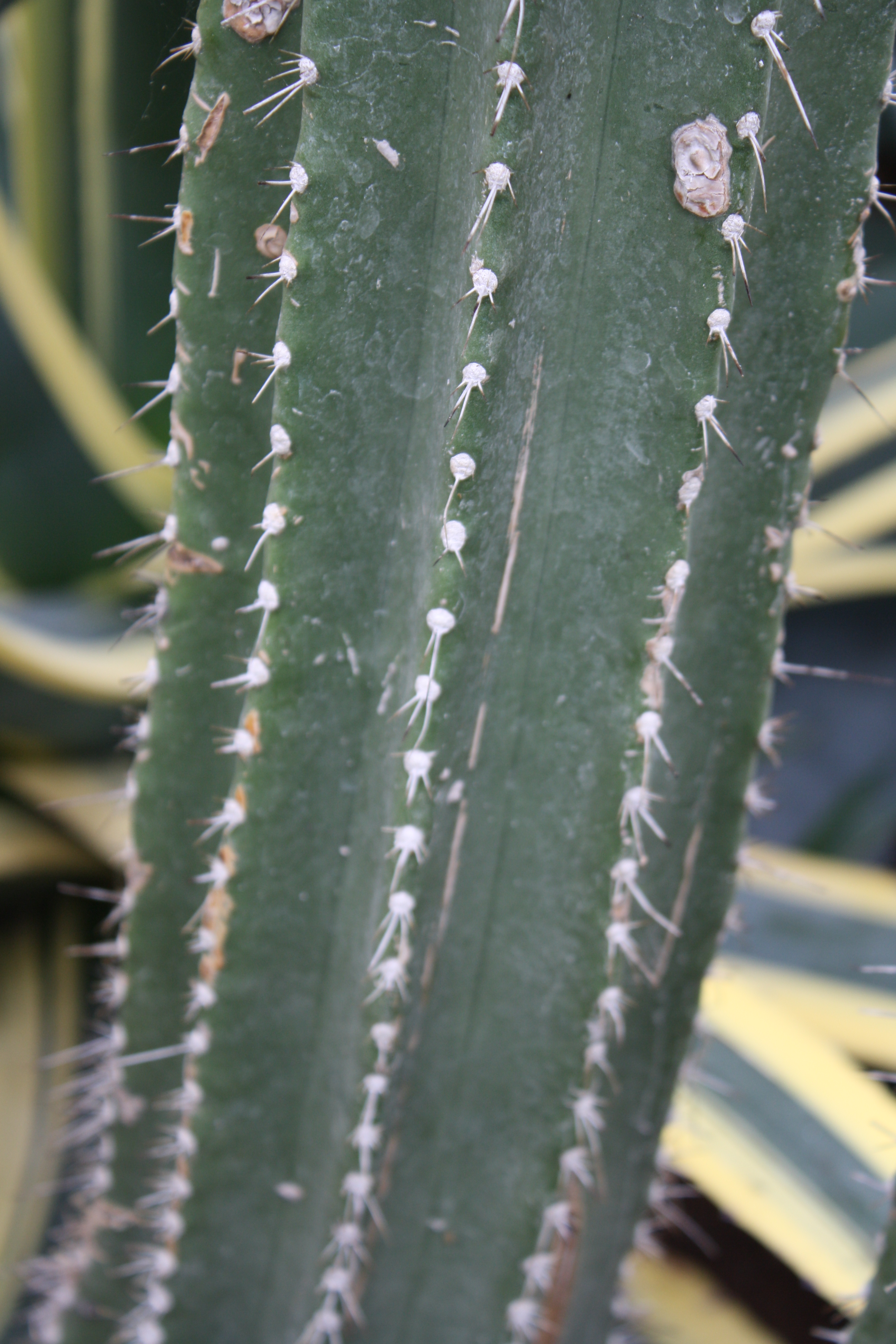 Morfoloģija. Daudzgadīgs, mūžzaļš, koši zaļš, ar pelēkzilu nokrāsu, liels, garš, stabveida kaktuss, kurš neveido sāndzinumus. Telpās izaug 1,5-2,0 m garumā. Stumbrs ar 9-10 zemām, ribām. Areolas pelēkas ar nelielu vilnu. Nav izdalīti atsevišķi ne sānu, ne centrālie ērkšķi. Visi ērkšķi vērsti uz leju, melni, cieti, 2-2,5 cm gari. Ziedi sarkanrozā ,8-10 cm gari. Telpās zied tad, kad sasniedz iespaidīgu garumu un lielumu.