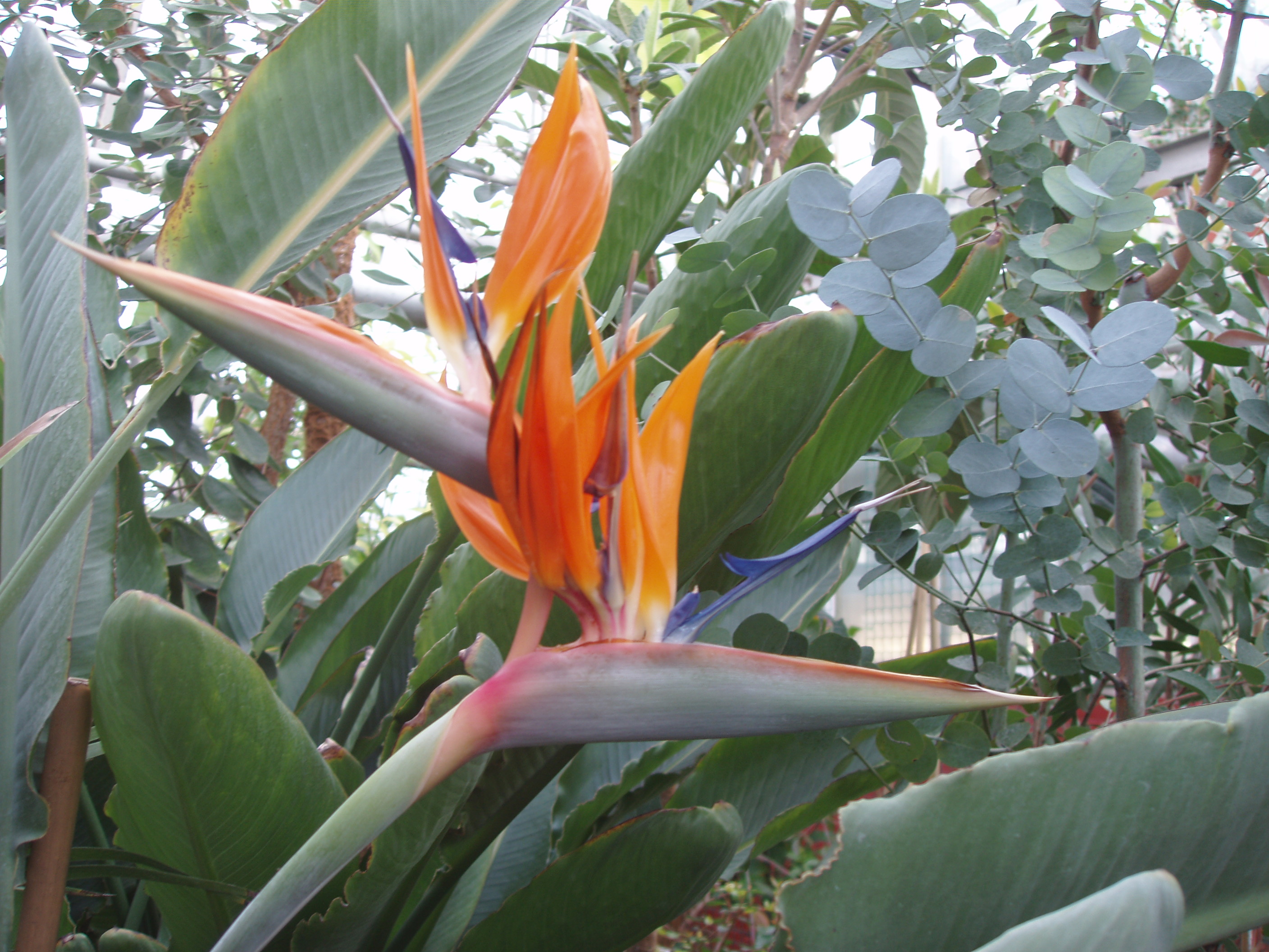 Morfoloģija. Mūžzaļš, daudzgadīgs lakstaugs, kas telpās izaug līdz 2 metru augstumam, ar gumveida saknēm un bez stumbra. Lapas izaug cera veidā pie sakņu kakla, pie kura arī veidojas jaunie dzinumi. Lapas ādainas, spīdīgas, tumši zaļas, apakšpuse gaišāka, lielas, vienkāršas, iegareni eliptiskas, 30-50 cm garas, 15-20 cm platas, ar gludu malu. Lapu kāti pat nedaudz garāki par lapu plātnēm. Saknes resnas, trauslas, gaļīgas. Ziedneši attīstās lapu žāklēs. Ziedkopas nedaudz paceļas virs lapām. Ziedkopa sirpjveida un sastāv no 3-5 ziediem. Kauslapas ir spilgti oranžas, vainaglapas – zilas. Zied no februāra līdz maijam.