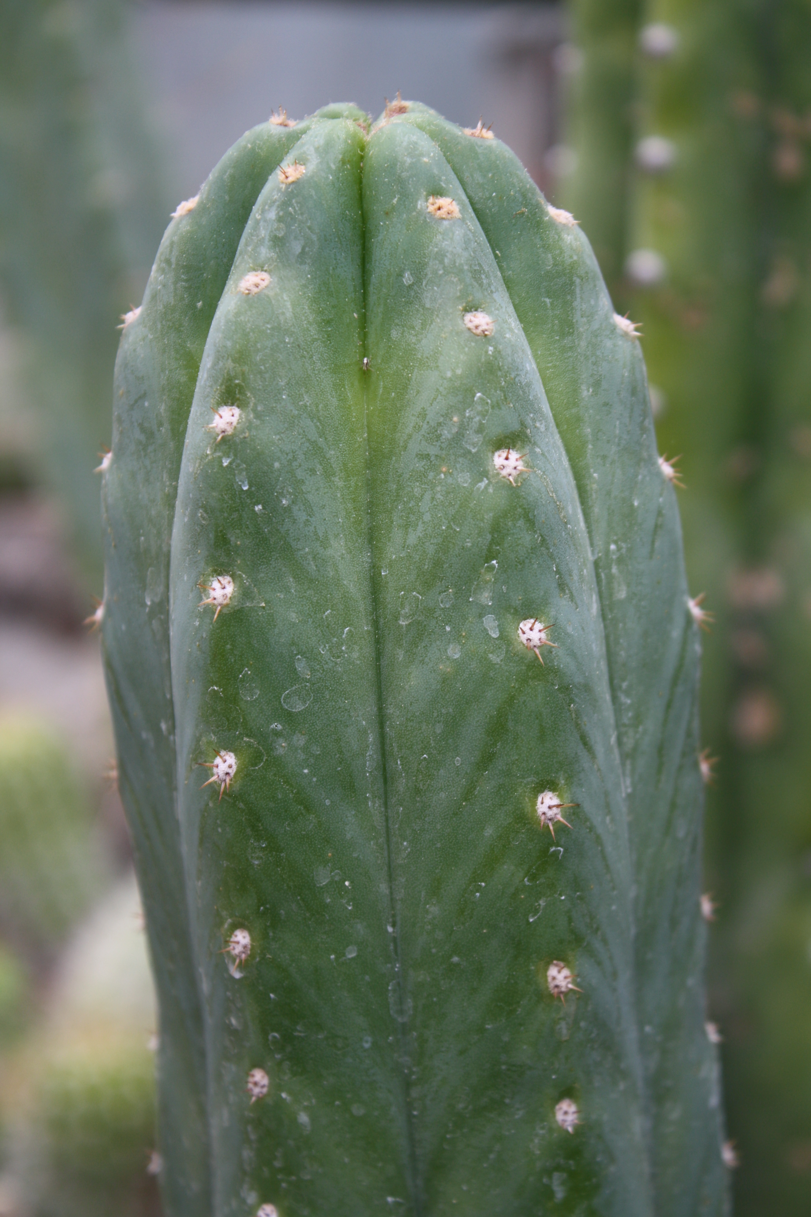 Morfoloģija. Daudzgadīgs, mūžzaļš, zilganzaļš, ar vaska kārtu, liels, garš, stabveida kaktuss, kurš maz veido sāndzinumus. Telpās izaug 1-1,5 m garumā. Stumbrs ar 6-8 zemām ribām. Zem areolām neliels padziļinājums. Ērkšķi 3-6, tumši dzelteni līdz brūni, 0,5-1 cm gari. Ērkšķi var arī nebūt. Ziedi balti, piltuvveida, 20 cm gari. Telpās zied lieli un veci kaktusi. Ziedi atveras naktī un zied līdz pusdienas laikam.