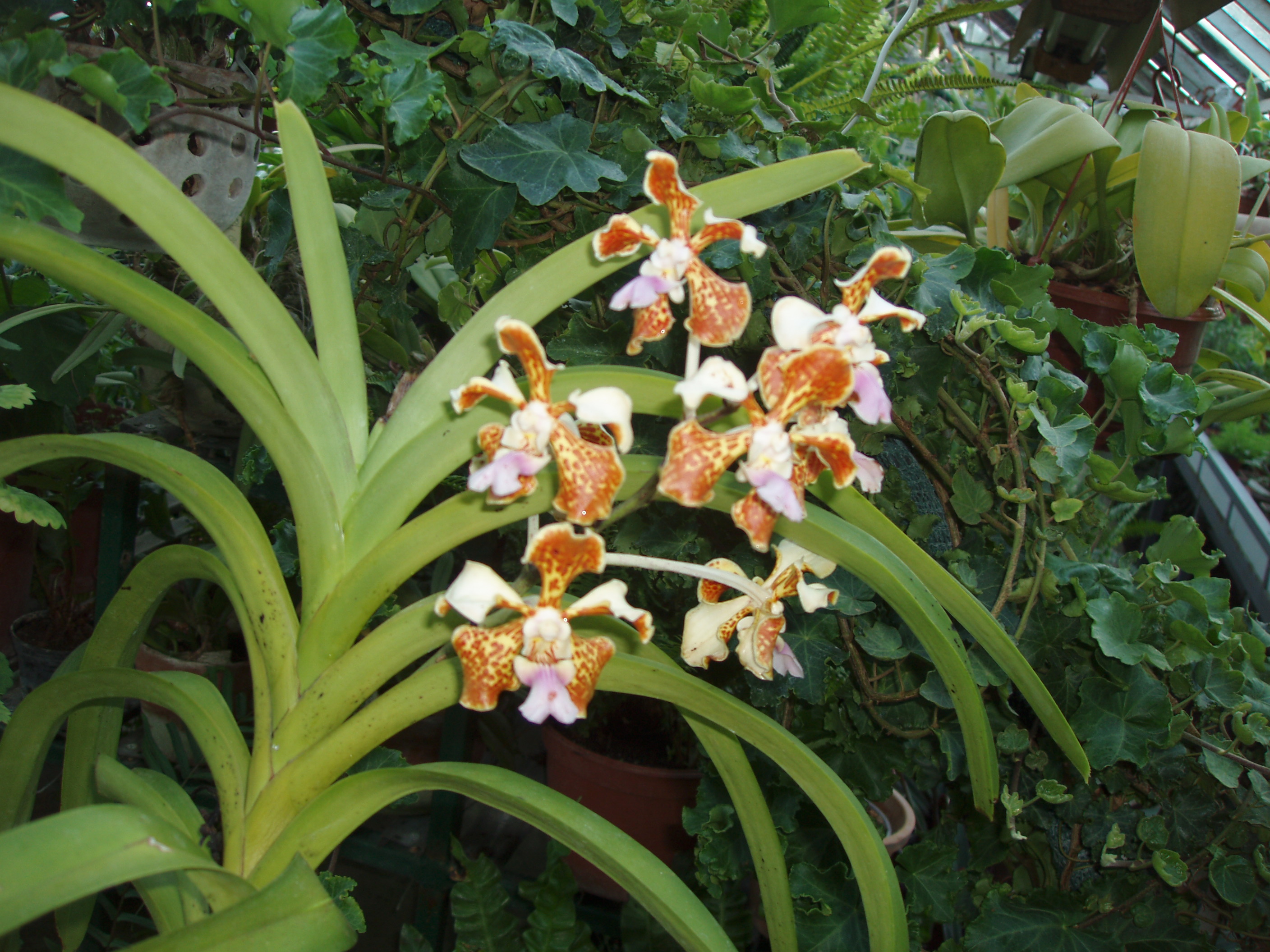 Morfoloģija. Mūžzaļa, daudzgadīga epifītorhideja, kura telpās izaug 1-1,5 metrus augsta. Visu stumbru apņem skaujošas, ādainas, siksnveidīgas, 30-40 cm garas, 3-3,5 cm platas, tumši zaļas lapas. Ziednesis attīstās stumbra augšdaļā, lapu žāklē; tas ir īsāks par lapām. Ziedkopa ir nokarens ķekars ar 6-12 smaržīgiem ziediem, 5-7,5 cm diametrā. Visas apziedņa lapas bāli dzeltenīgas, ar sarkanbrūniem raibumiem. Lūpa ir koši sarkanvioleta. Zied rudenī, ziemā. Ziedi ilgnoturīgi.