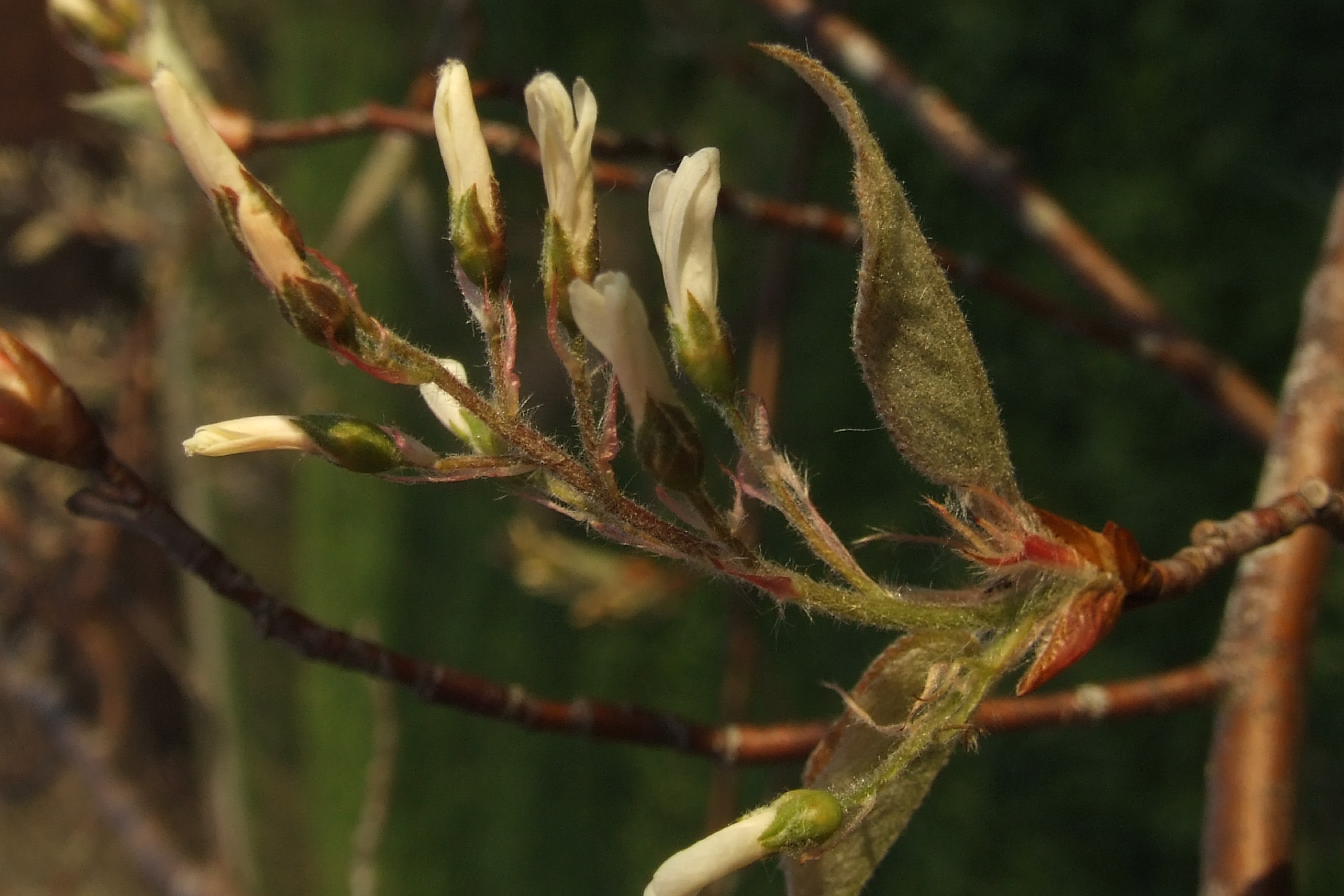 Morfoloģija. Vasarzaļš stāvs krūms ar atvasēm vai neliels koks. Dzinumi kaili, pelēki. Lapas ovālas, līdz 6 cm garas, auga ziedēšanas laikā balti tūbainas, ieritinātas, vēlāk gandrīz kailas. Aprīlī, auga ziedēšanas laikā, ķekars stāvs, tūbains, 5 – 15 cm garš. Ziedi balti. Ziedgultne tūbaina. Augļi tumši purpursarkani līdz melni, ar zilu apsarmi, 0,7 – 1 cm biezi. Rudenī lapas iekrāsojas koši sarkanas.