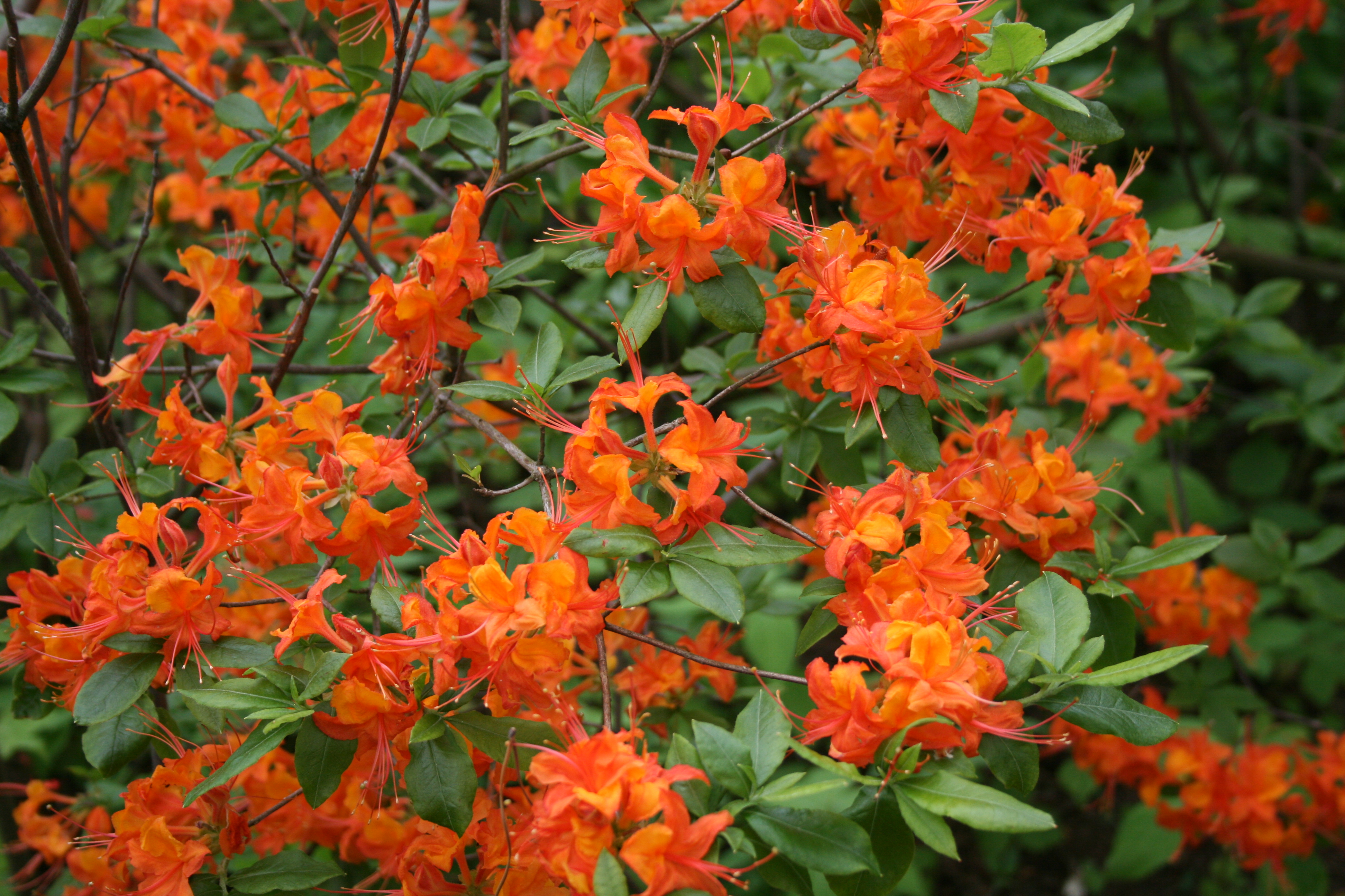 Morfoloģija. Vasarzaļš, stāvs krūms, reti koks. Pārsvarā 1-3 m augsts, ja koks, tad 4-10 m. Dzinumi ar matiņiem. Miza gluda. Lapas sākumā ar matiņiem, rudenī krāsojas oranžas līdz karmīnsarkanas. Forma plati līdz iegareni eliptiska, pārsvarā 4,5-9,0 cm garas un 1,3-3,3 cm platas. Ziedi piltuvveida, sakārtoti ziedkopās pa 5-7, 3-5 cm plati, dzeltenoranži, laškrāsas, oranži līdz koši sarkani ar kontrastējošu plankumu dzeltenā, oranžā vai tumšākā tonī, smaržīgi. Uzzied reizē ar lapu plaukšanu maijā - jūnijā.
