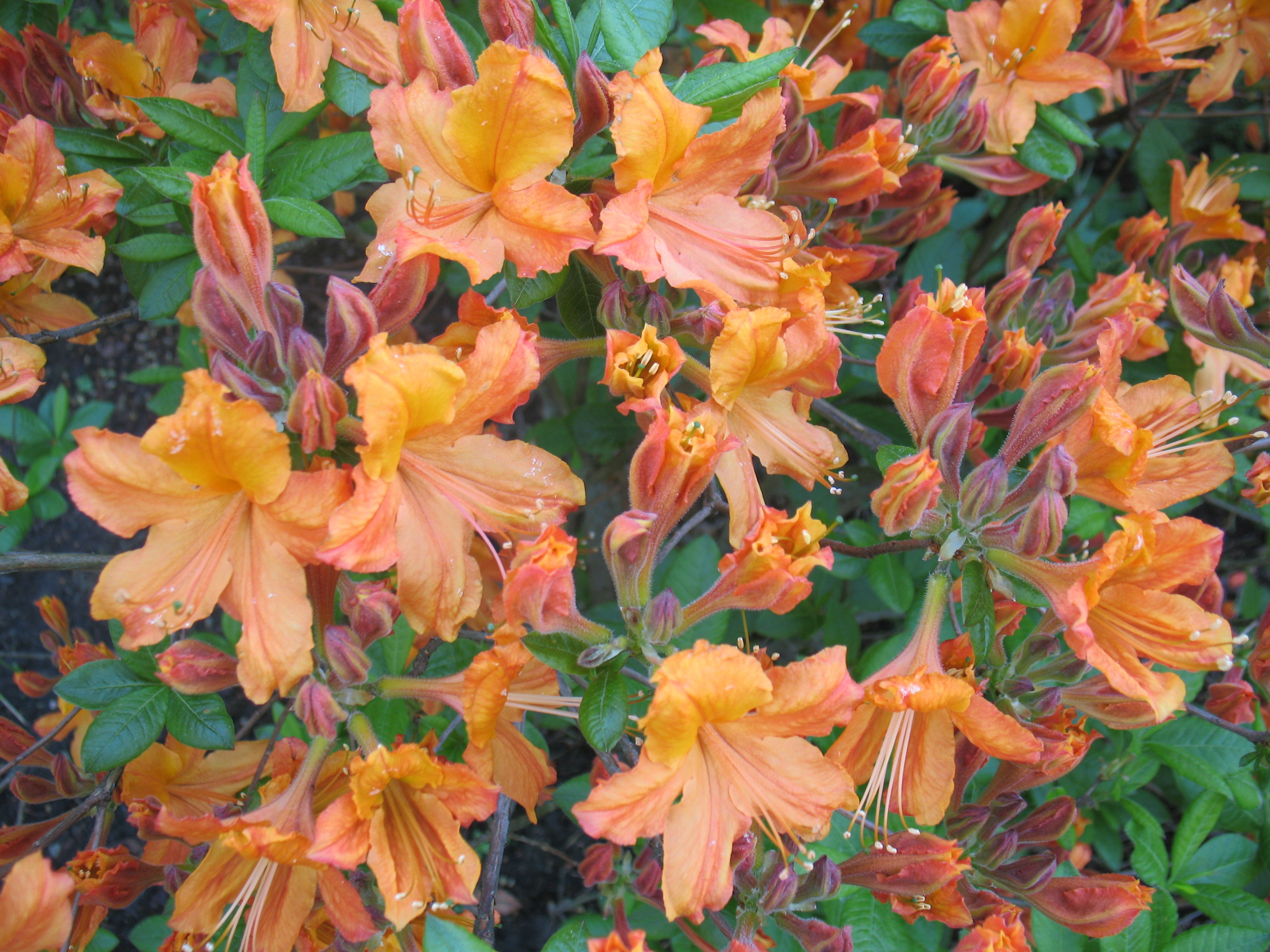 Morfoloģija. Vasarzaļš krūms. Augstums 2 m sasniegts 20 gados. Lapas tumši zaļas virspusē, apakšpusē zaļas, eliptiskas, nosmaiļotas, līdz 8 cm garas un līdz 4 cm platas. Ziedi pa 9-12 sakārtoti 13cm diametrā un 4 cm augstās, puslodveida saplacinātās, irdenās ziedkopās, stobrveida piltuvveida, 8 cm diametrā, oranžsārti ar dzeltenu lāsojumu. Zied jūnijā.