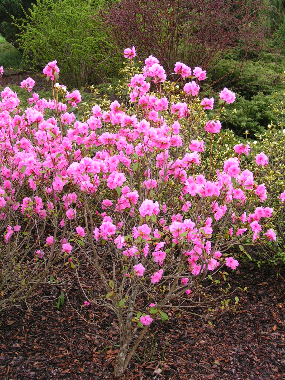 Morfoloģija. Daļēji mūžzaļš krūms. Augstums 2,5 m un platums 2 m, 10 gados sasniedz 1 m garumu un 0,8 m platumu. Lapas nelielas tumši zaļas, eliptiskas, nosmailotas, līdz 6 cm garas un līdz 3 cm platas, rudenī krāsojas sarkanos un oranžos toņos. Ziedi puspildīti, plati piltuvveida, līdz 3cm diametrā, fuksiju rozā krāsā, sakārtoti lodveida ziedkopās pa 4-9. Zied aprīlī - maijā.