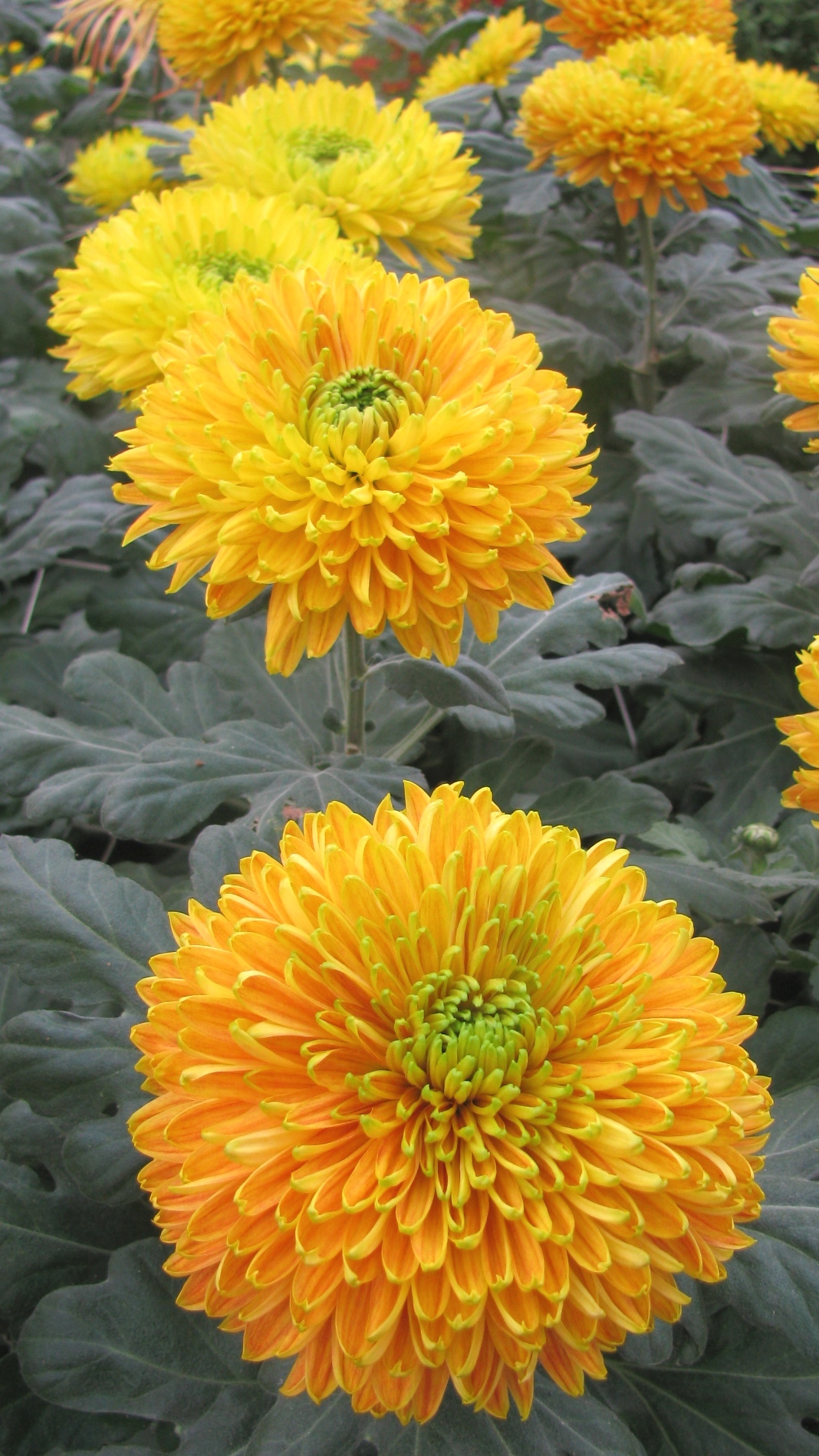 Morfologija. Daudzgadīgs lakstaugs ar bārkšveida sakni. Augums zems 50-60 cm, stublāji resni, noturīgi, tumši. Lapojums blīvs, spirālisks. Lapas vidēji lielas, gaiši zaļas. Ziedkopas ļoti pildītas, 16-17 cm lielas, lodveida, dzeltenas ar zaļganu centru, mēlziedi laiviņveida.