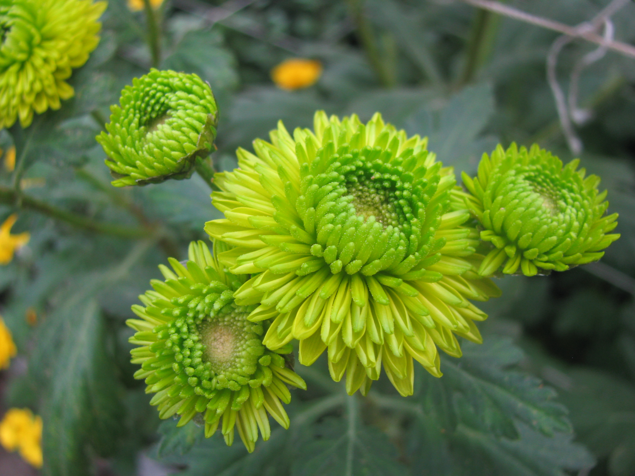 Morfoloģija. Daudzgadīgs lakstaugs ar bārkšveida sakni. Augums 90-100 cm, stublāji vidēji resni, noturīgi maz zaroti. Lapas gaiši zaļas, nelielas, izvietotas spirāliski, vidēji cieši ap stublāju. Ziedkopas zaļas, pomponveida, 5-6 cm lielas, ļoti blīvas, mēlziedi īsi, laiviņveida.