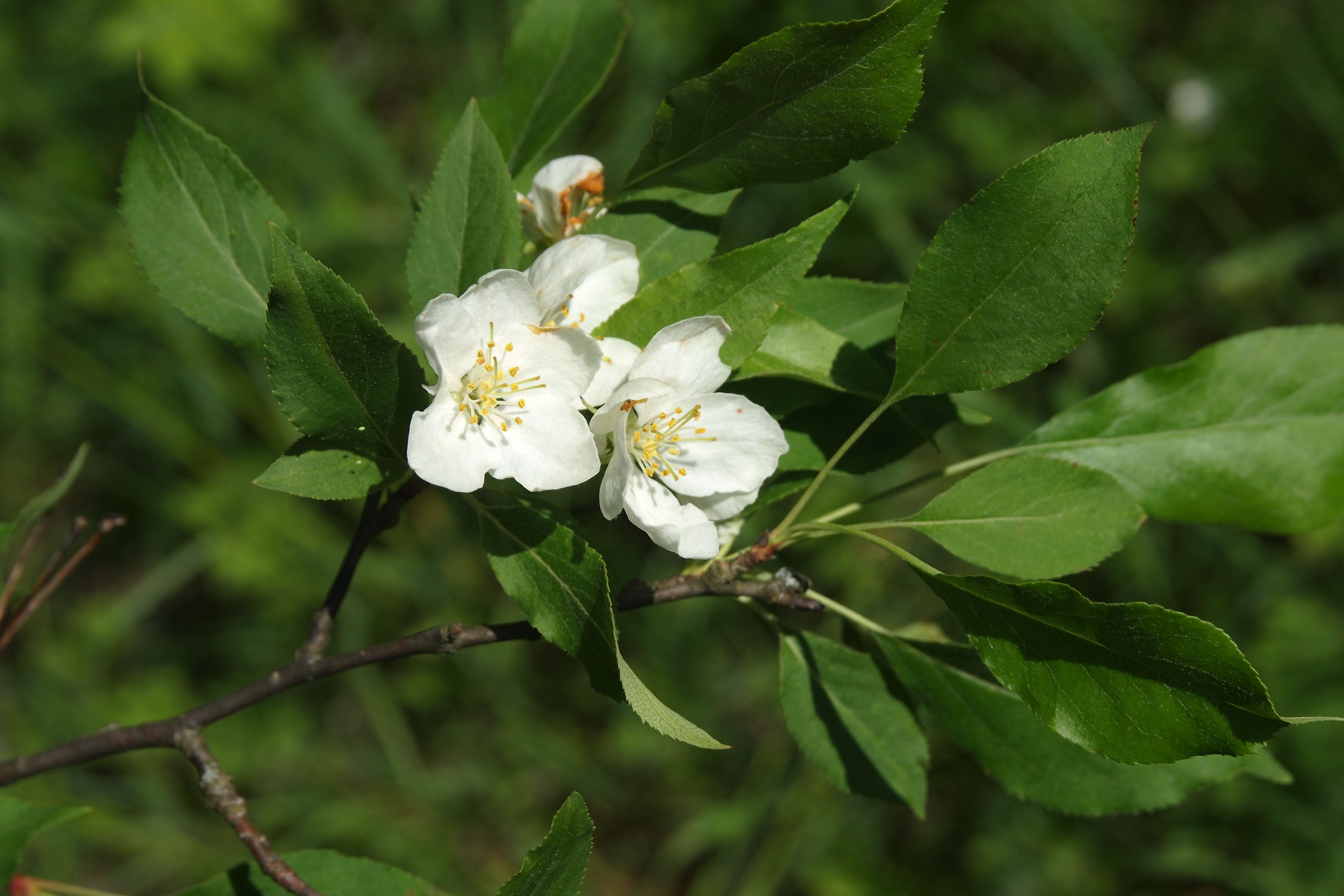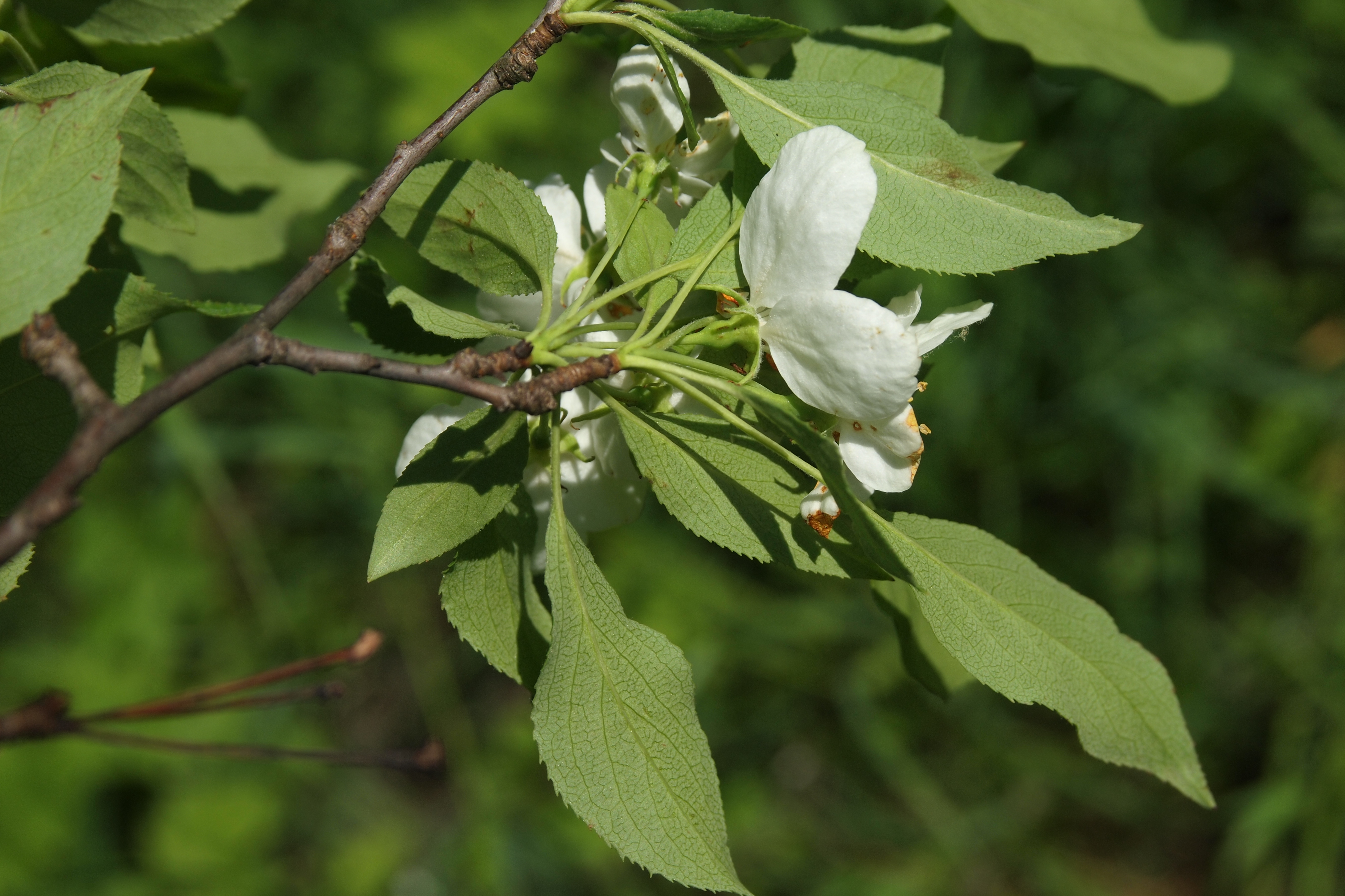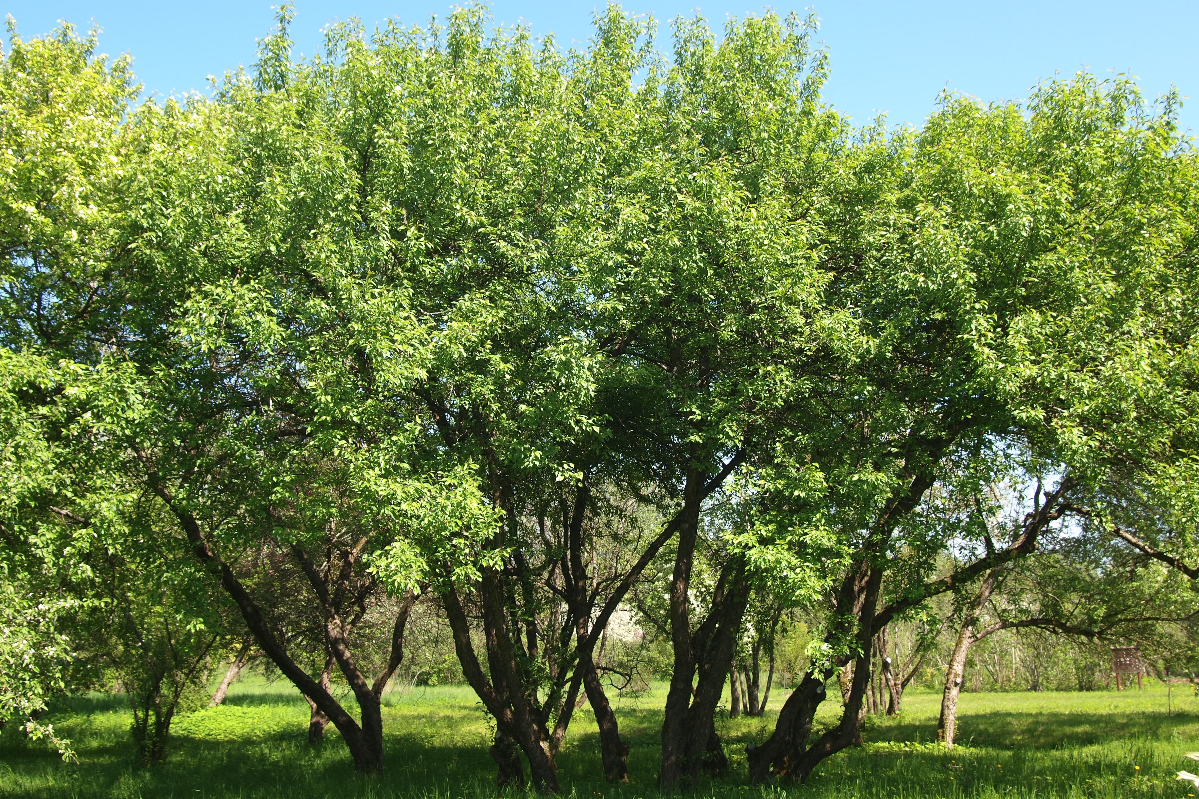Morfoloģija. Vasarzaļš, 6 – 8 m augsts koks vai krūms. Miza tumši pelēka vai gandrīz melna, jaunie dzinumi sarkanīgi. Lapas iegarenas vai olveidīgas, ar ķīļveida pamatu un izstieptu galotni, malas zobainas, kātiņš ar matiņiem. Ziedi smaržīgi, balti vai gaiši rozā, 3 – 5 cm plati. Ziedgultne kā arī kauslapas parasti kailas vai viegli matainas, retāk pūkainas. Augļi iegareni vai ieapaļi, 0,8 – 1 cm plati, cieti un skābi, ilgi saglabājas pie koka, nenokrīt pat ziemā. Pilnīgi gatavi mīksti, dažkārt caurspīdīgi, bez kausiņa.