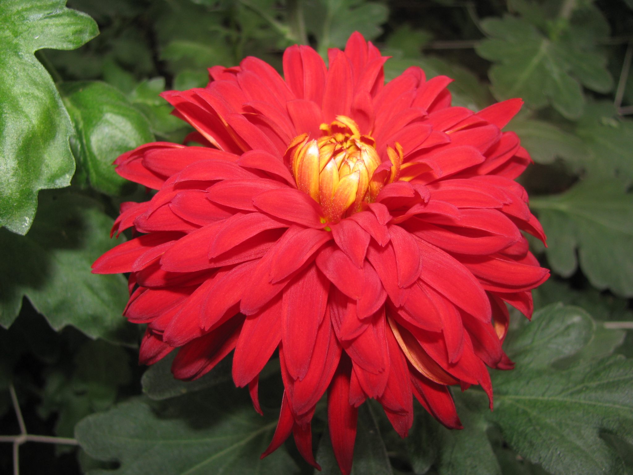 Morfologija. Daudzgadīgs īsās dienas lakstaugs ar bārkšveida saknēm. Augums vidējs 60-80 cm, stublāji tumši. Lapas tumši zaļas izvietotas cieši. Ziedkopas puslodveida, sarkanas, diametrs13-14,5 cm, mēlziedi plati lentveida.