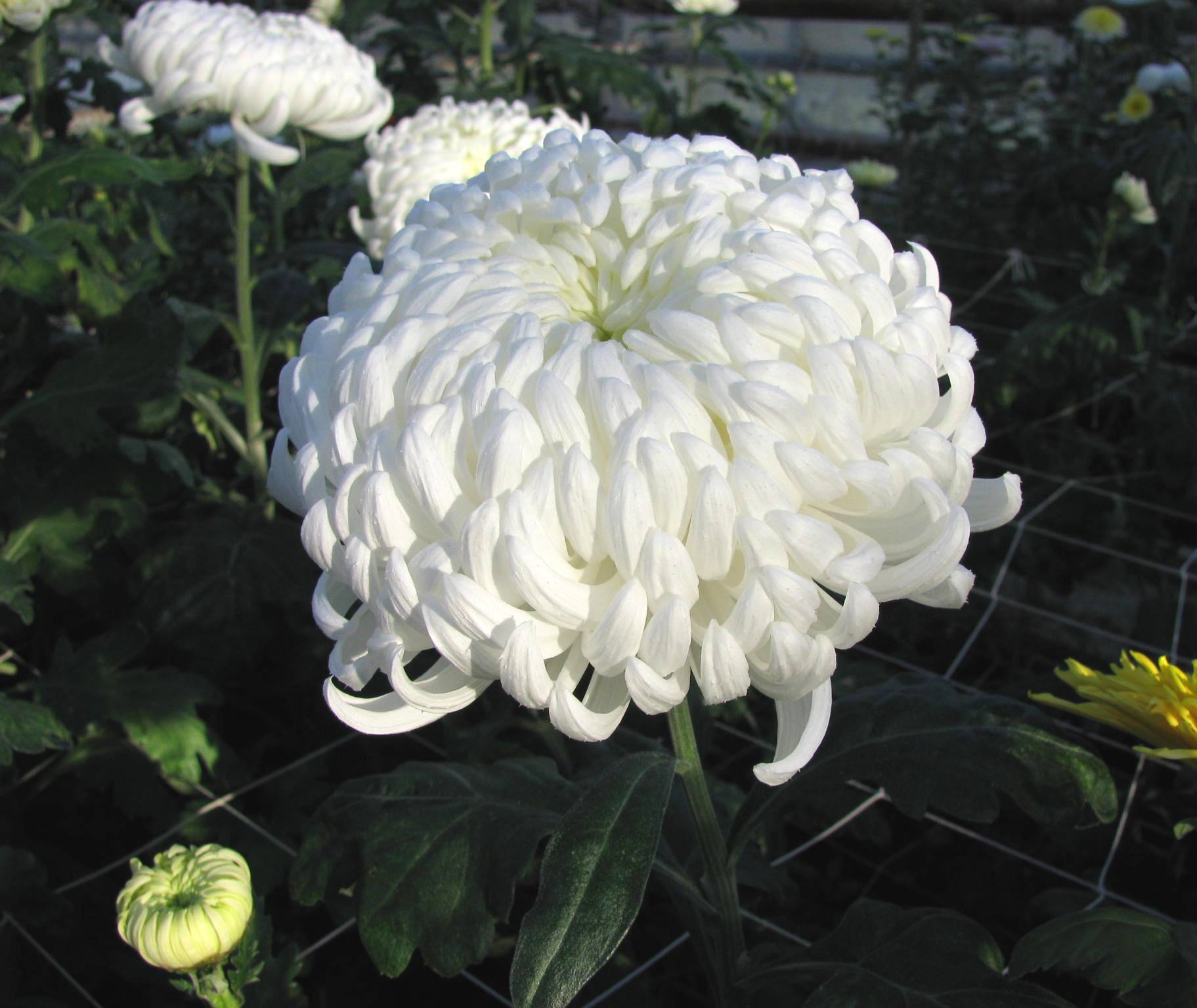 Morfoloģija. Daudzgadīgs lakstaugs ar bārkšveida sakni. Augu augstums 100-110 cm, lapas lielas, nokarenas, vidēji cieši un spirāliski izvietotas ap resnu un noturīgu stublāju. Ziedkopas lielas 16-18 cm, baltas, lodveida, mēlziedi laiviņveida.