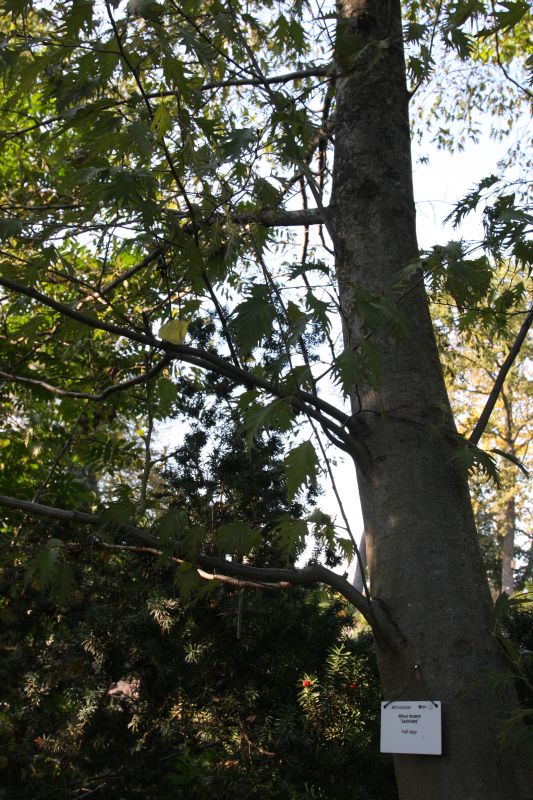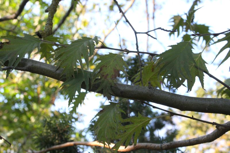 Morfoloģija. Stumbrs ir izliekts, miza gaiši pelēka un gluda. Jaunie dzinumi ir mataini. Lapas zaļas, dziļi šķeltas, iegarenas, asimetriskas, ar asi smailu galu.